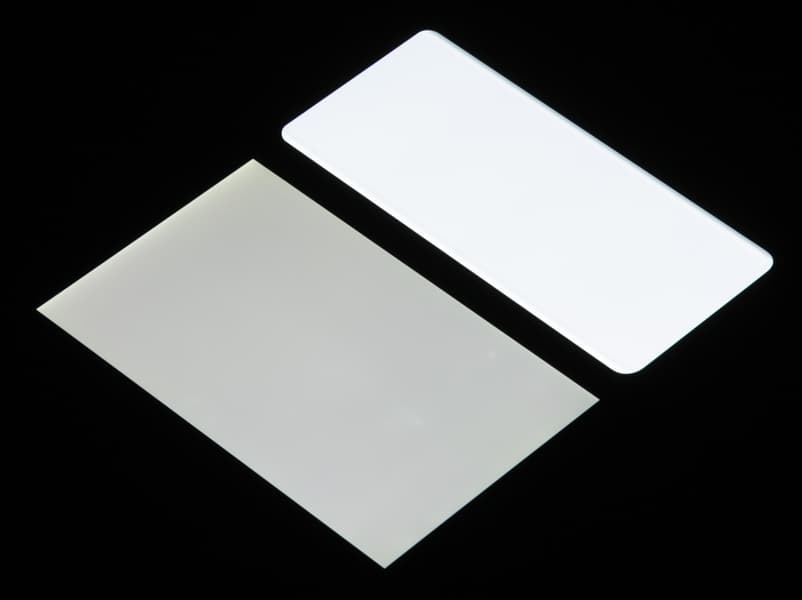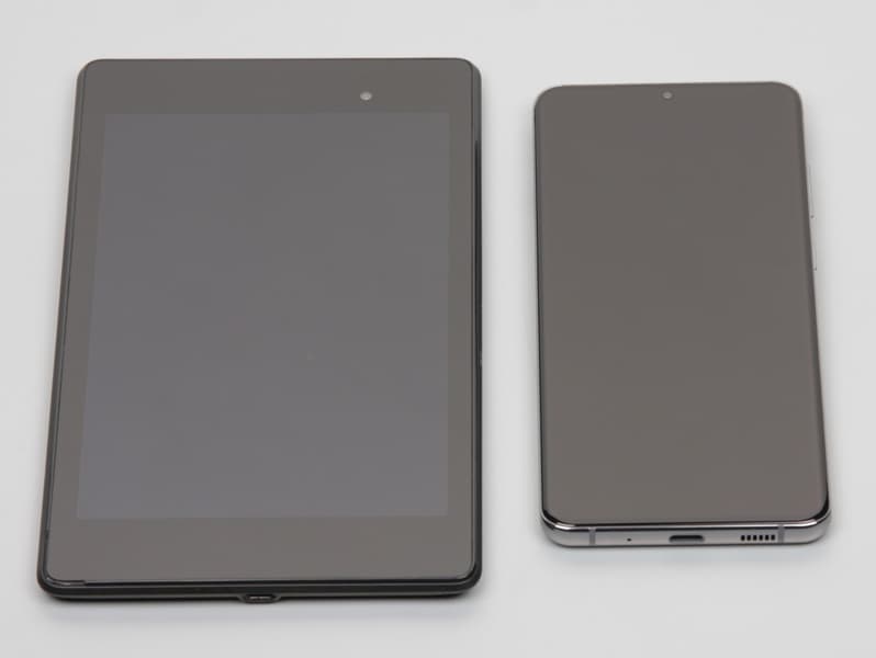 Лицевая поверхность экрана выполнена в виде стеклянной пластины с зеркально-гладкой поверхностью, устойчивой к появлению царапин. Судя по отражению объектов, антибликовые свойства экрана лучше, чем у экрана Google Nexus 7 (2013) (далее просто Nexus 7). Для наглядности приведем фотографию, на которой в выключенных экранах отражается белая поверхность (слева — Nexus 7, справа — Samsung Galaxy S20 Ultra 5G, далее их можно различать по размеру):