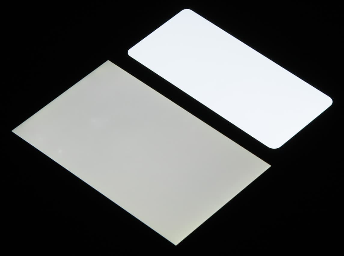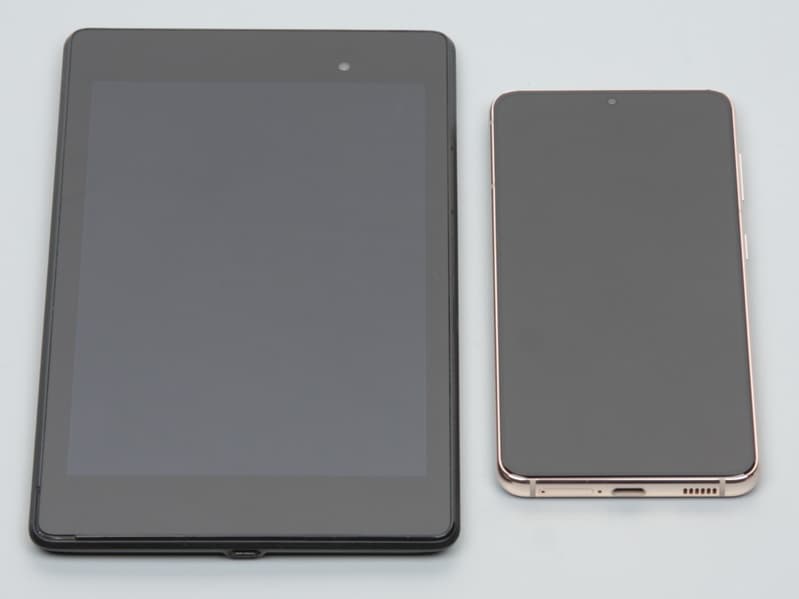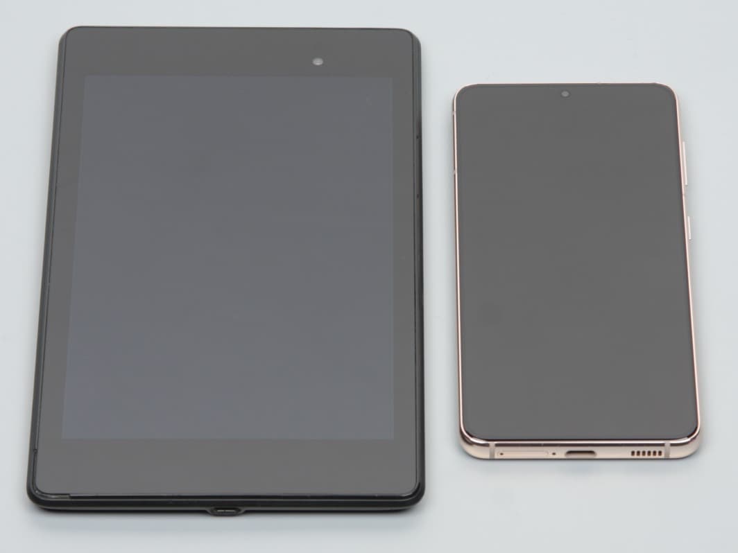 Лицевая поверхность экрана выполнена в виде стеклянной пластины с зеркально-гладкой поверхностью, устойчивой к появлению царапин. Судя по отражению объектов, антибликовые свойства экрана лучше, чем у экрана Google Nexus 7 (2013) (далее просто Nexus 7). Для наглядности приведем фотографию, на которой в выключенных экранах отражается белая поверхность (слева — Nexus 7, справа — Samsung Galaxy S21 5G, далее их можно различать по размеру):