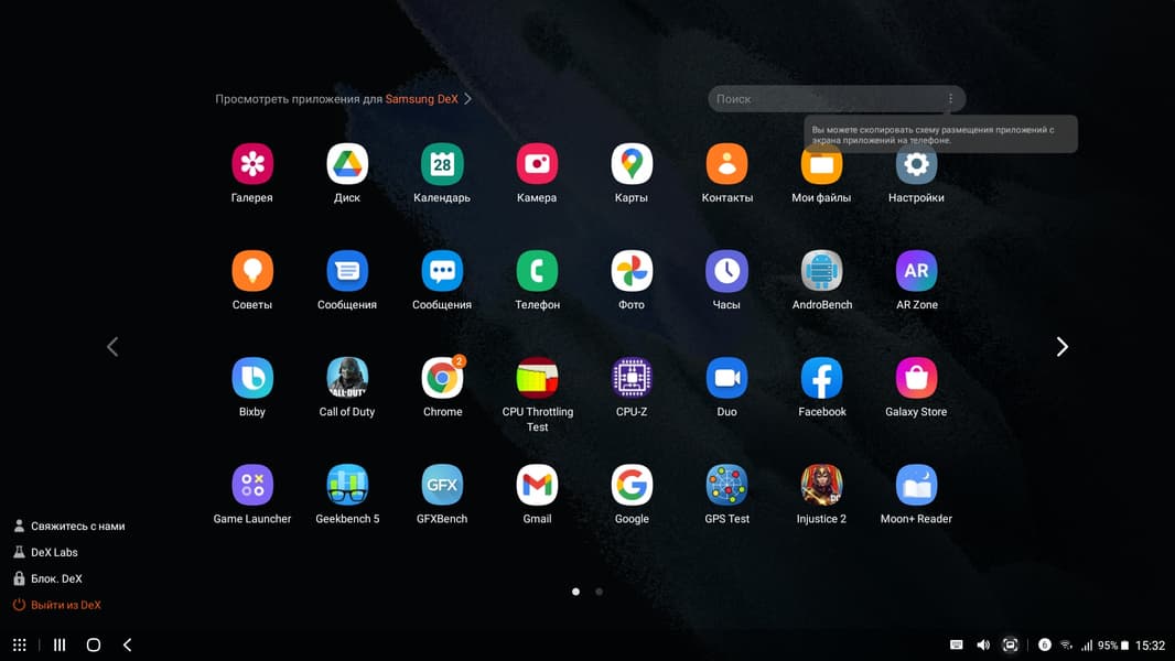 Оптимизированные для Samsung DeX приложения можно установить из фирменного магазина. Управляющая панель в нижней части экрана убирается при выводе изображения на весь экран (например, при воспроизведении видео). Вывод на монитор осуществляется в истинном разрешении 1920 на 1080 пикселей и точка в точку с кадровой частотой 60 Гц. Отметим, что одновременно с выводом изображения и звука можно по USB или по Bluetooth подключать к смартфону мышь и клавиатуру, превращая его в основу для рабочего места. Кроме того, читаются подключенные к адаптеру USB-накопители. Для физической клавиатуры поддерживаются переключение языка и ряд горячих сочетаний клавиш. Поддерживается также подключение к проводной сети на скорости 1 Гбит/с.