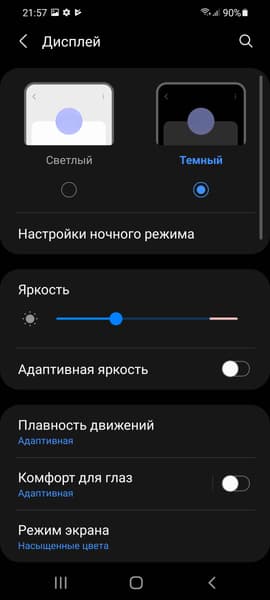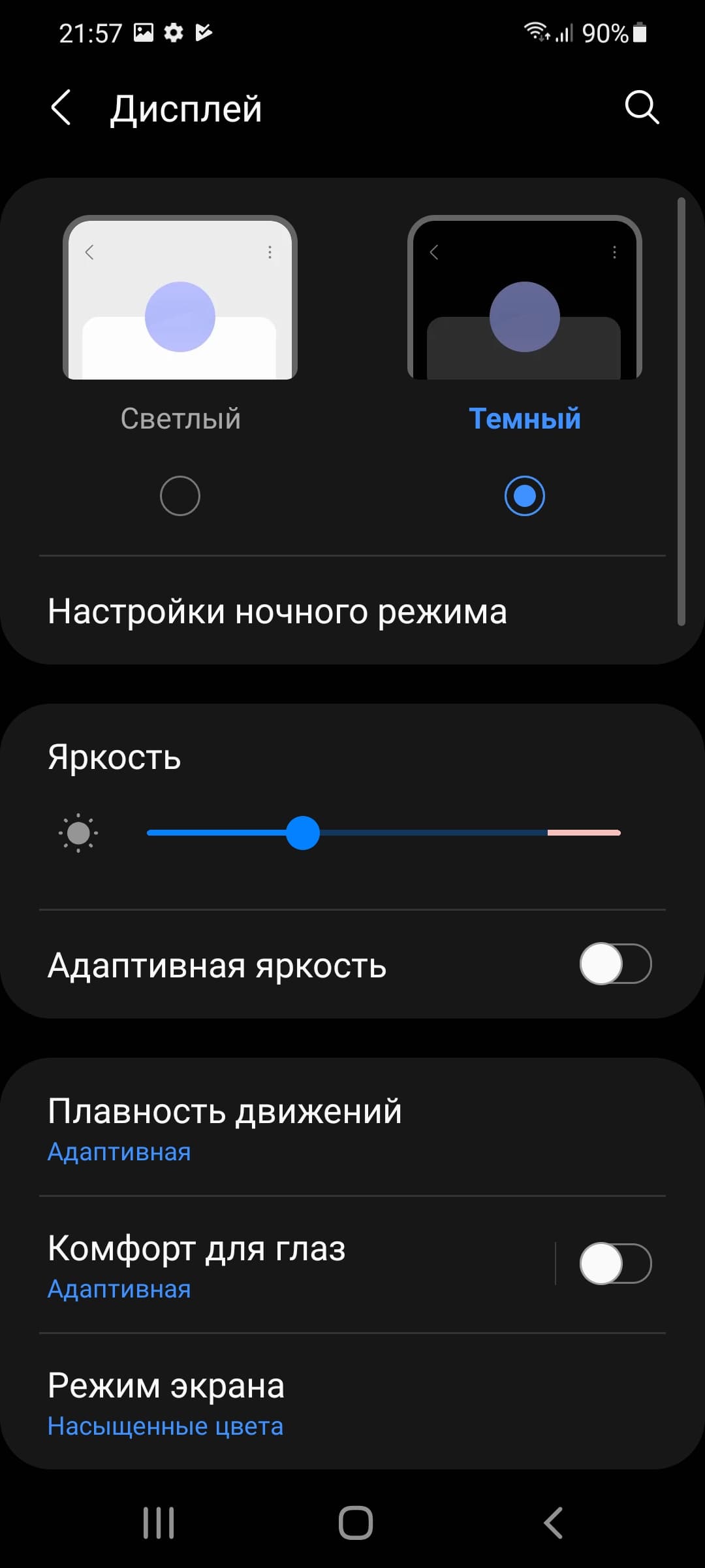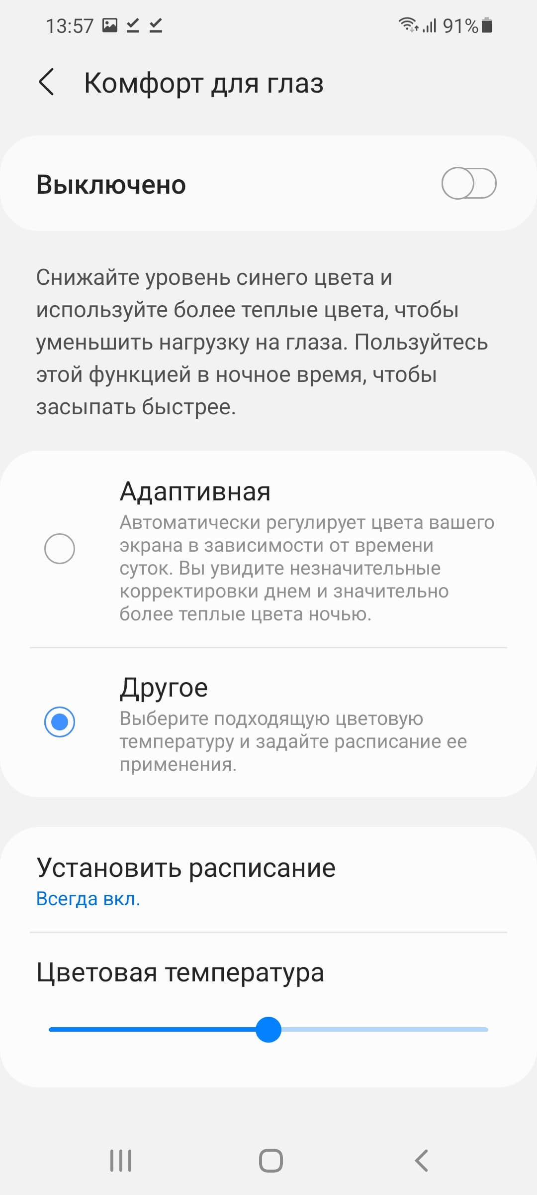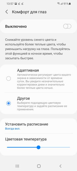 Есть модная функция Комфорт для глаз, для которой в настройках даже приведено белее-менее корректное описание. Почему такая коррекция может быть полезной, рассказано в статье про iPad Pro 9,7″. В любом случае, при развлечении с планшетом или смартфоном на ночь глядя лучше просто снизить яркость экрана до низкого, но еще комфортного уровня. Желтить экран этой настройкой нет никакого смысла.