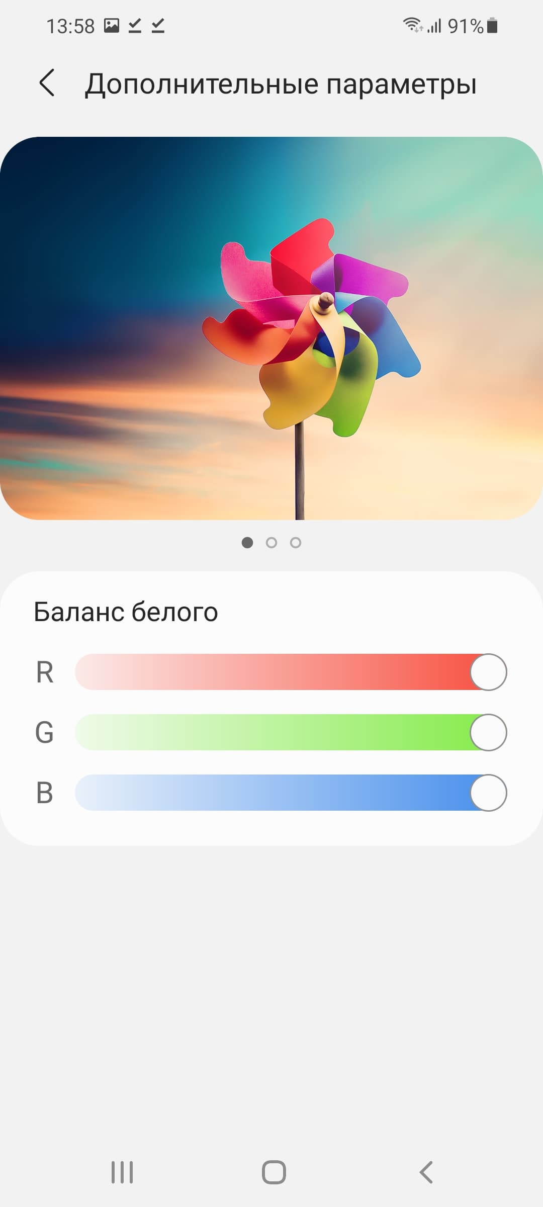 Почему-то только при выборе профиля Насыщенные цвета появляется возможность настройки цветового баланса регулировкой цветовой температуры и тремя регулировками интенсивности основных цветов, но из-за слишком широкого цветового охвата как раз в этом профиле нет смысла исправлять именно баланс.