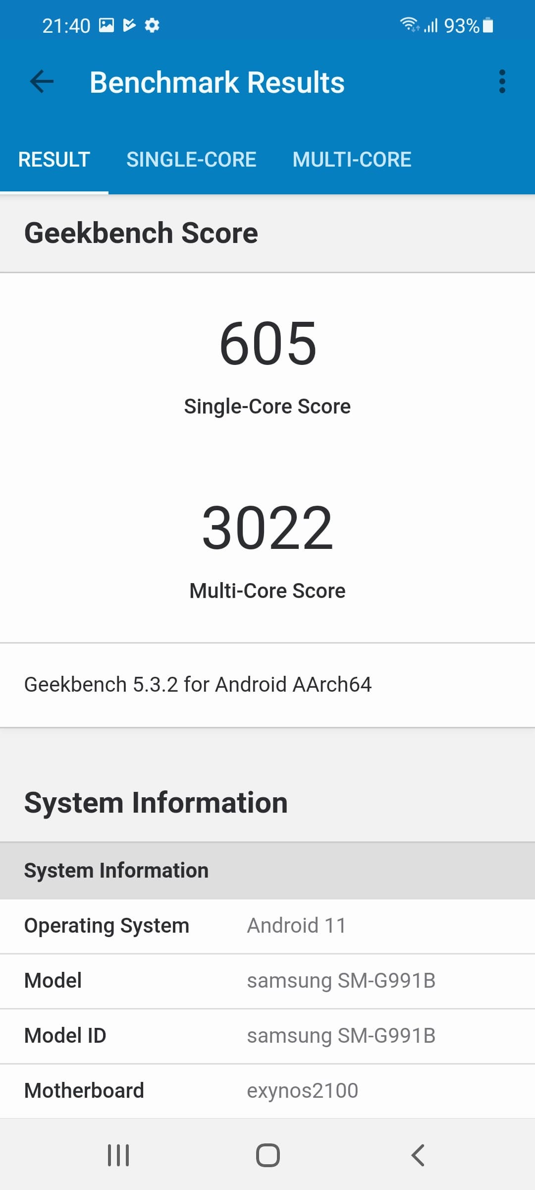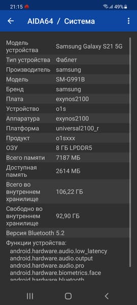 - SoC Exynos 2100, 8 ядер (1×Cortex-X1 @2,9 ГГц + 3×Cortex-A78 @2,80 ГГц + 4×Cortex-A55 @2,2 ГГц)