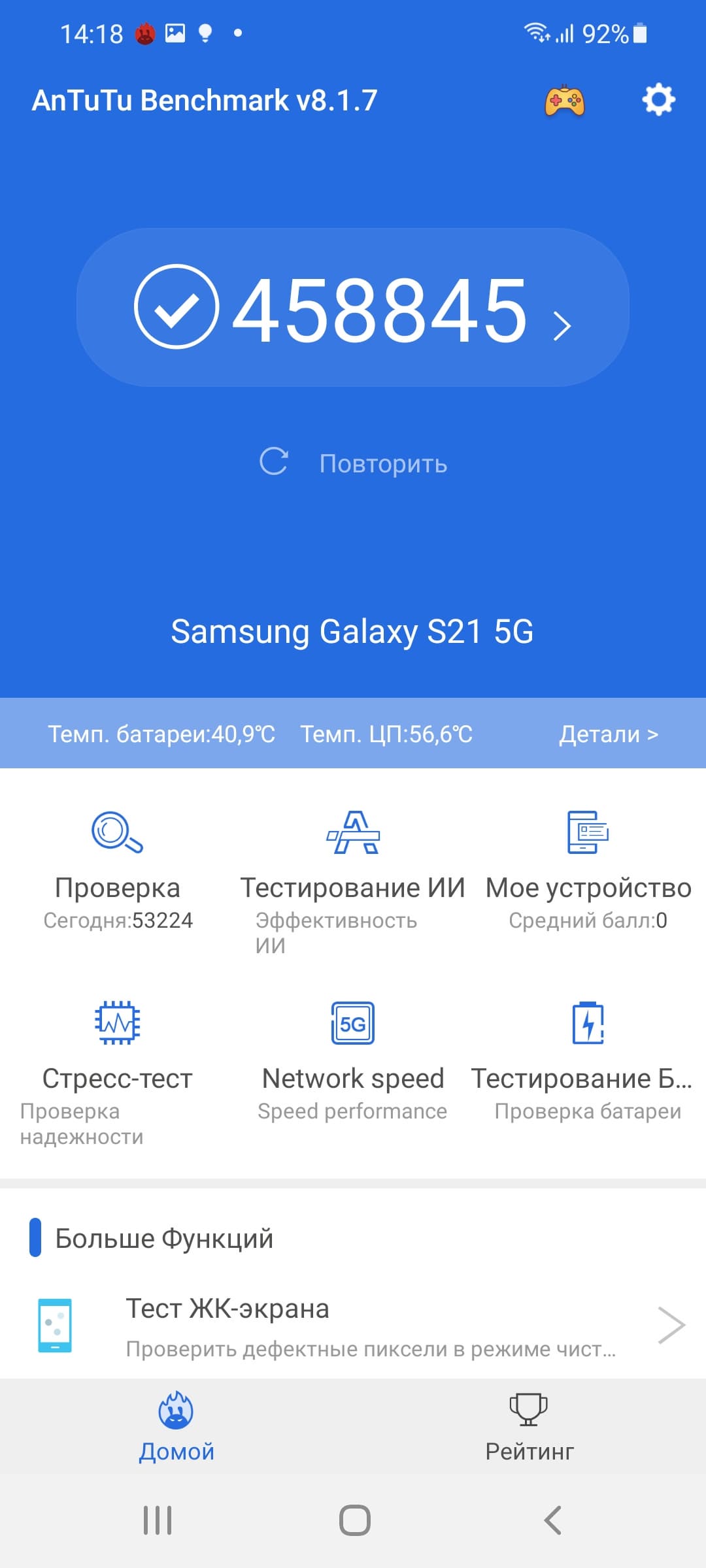 SoC Exynos 2100 — это топовая мобильная платформа Samsung. В реальном применении интерфейс и приложения работают быстро и плавно, однако в синтетических тестах младшая модель S21 набирает меньше баллов (в том же AnTuTu), чем старшая — очевидно, из-за разницы в объеме ОЗУ и других аппаратных различий. С любыми играми смартфон справляется легко, без притормаживаний.
