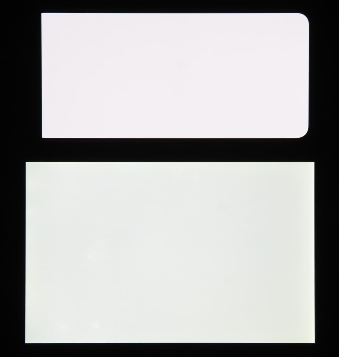 Экран характеризуется великолепными углами обзора. Правда, белый цвет при отклонении даже на небольшие углы приобретает сначала легкий розоватый потом сине-зеленый оттенок, но черный цвет остается просто черным под любыми углами. Он настолько черный, что параметр контрастности в данном случае неприменим. Для сравнения приведем фотографии, на которых на экраны Samsung Galaxy S21 5G (профиль Насыщенные цвета) и второго участника сравнения выведены одинаковые изображения, при этом яркость экранов по белому полю изначально установлена примерно на 200 кд/м², а цветовой баланс на фотоаппарате принудительно переключен на 6500 К.