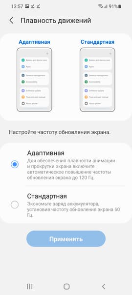 В настройках экрана можно включить режим с повышенной до 120 Гц частотой обновления. В этом режиме нам как минимум обещают увеличение плавности прокрутки.
