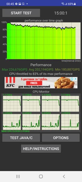 Тестирование традиционно проводилось на обычном уровне энергопотребления без использования функций энергосбережения, хотя таковые в аппарате имеются. Условия тестирования: выставлен минимальный комфортный уровень яркости (примерно 100 кд/м²). Тесты: беспрерывное чтение в программе Moon+ Reader (со стандартной, светлой темой); беспрерывный просмотр видео в HD-качестве (720р) через домашнюю сеть Wi-Fi; игра Injustice 2 с автонастройками графики.