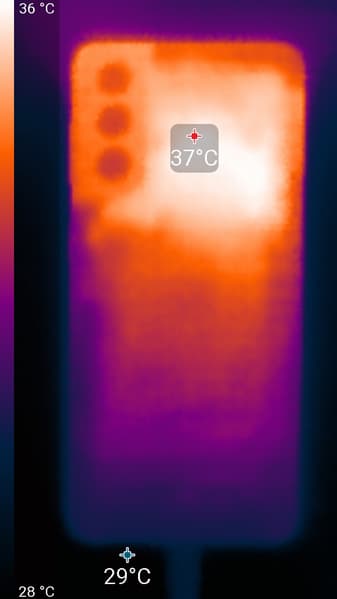 Нагрев выше в верхней части, что, видимо, соответствует расположению микросхемы SoC. По данным теплокамеры, максимальный нагрев составил 37 градусов (при температуре окружающего воздуха в 24 градуса), это не очень много.