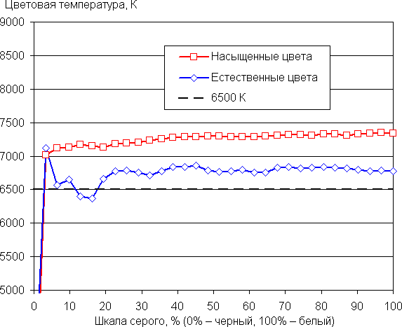 Баланс оттенков на шкале серого хороший. Цветовая температура, особенно после выбора профиля Естественные цвета близка к 6500 К, при этом на значимом участке шкалы серого этот параметр изменяется не очень сильно, что улучшает визуальное восприятие баланса цветов. Отклонение от спектра абсолютно черного тела (ΔE) на большей части шкалы серого остается ниже 10 единиц, что для потребительского устройства считается хорошим показателем, и разброс этой характеристики также не очень большой: