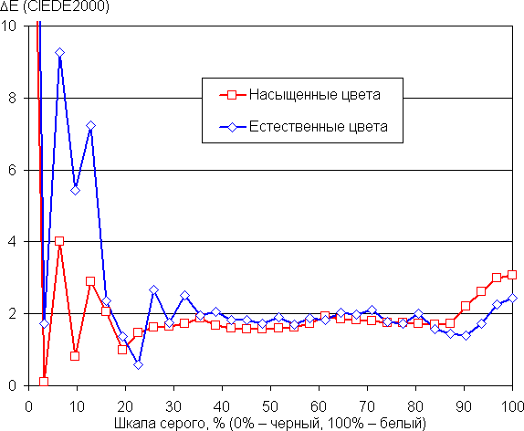 (Самые темные области шкалы серого в большинстве случаев можно не учитывать, так как там баланс цветов не имеет большого значения, да и погрешность измерений цветовых характеристик на низкой яркости большая.)