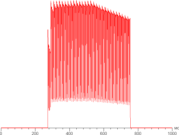 Переключение состояния элементов матрицы выполняется практически мгновенно, но на фронте включения может присутствовать ступенька шириной примерно 17 мс. Например, так выглядит зависимость яркости от времени при переходе от черного к белому и обратно (режим с частотой обновления 60 Гц):