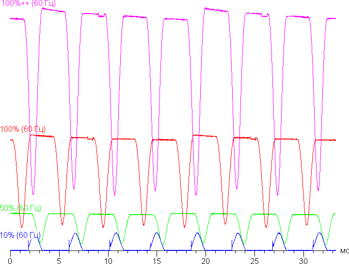 При выводе белого поля во весь экран и при ручном управлении яркостью ее максимальное значение составило порядка 415 кд/м² в обычных условиях, но на очень ярком свету оно повышается до 800 кд/м². Также нужно учитывать тот факт, что в данном случае чем меньше площадь белого на экране, тем он светлее, то есть фактическая максимальная яркость белых участков будет почти всегда выше указанного значения. В итоге читаемость экрана днем на солнце должна быть на отличном уровне, а темная тема не только экономит заряд аккумулятора, но способствует лучшей разборчивости информации на экране в условиях высокой освещенности. Минимальное значение яркости — 1,6 кд/м², то есть пониженный уровень яркости без проблем позволяет использовать устройство даже в полной темноте. Работает автоматическая регулировка яркости по датчику освещенности (он расположен под экраном близко к верхнему краю и правее центра). Работа этой функции зависит от положения ползунка регулировки яркости: им пользователь может попытаться выставить желаемый уровень яркости в текущих условиях. Если оставить все по умолчанию, то в полной темноте функция автояркости уменьшает яркость до 8 кд/м² (немного темновато), в условиях освещенного искусственным светом офиса (примерно 550 лк) устанавливает на 115 кд/м² (нормально), а условно под прямыми лучами солнца повышает до 800 кд/м² (до максимума, так и нужно). Результат нас не совсем устроил, поэтому в полной темноте мы чуть увеличили яркость, получив в итоге для трех условий, указанных выше, следующие значения: 20, 120 и 800 кд/м² (идеальное сочетание). Получается, что функция автоподстройки яркости работает адекватно и в какой-то степени позволяет пользователю настраивать свою работу под индивидуальные требования. На любом уровне яркости присутствует значимая модуляция с частотой 240 Гц. На рисунке ниже приведены зависимости яркости (вертикальная ось) от времени (горизонтальная ось) для нескольких значений настройки яркости. Сначала для режима с частотой обновления 60 Гц:
