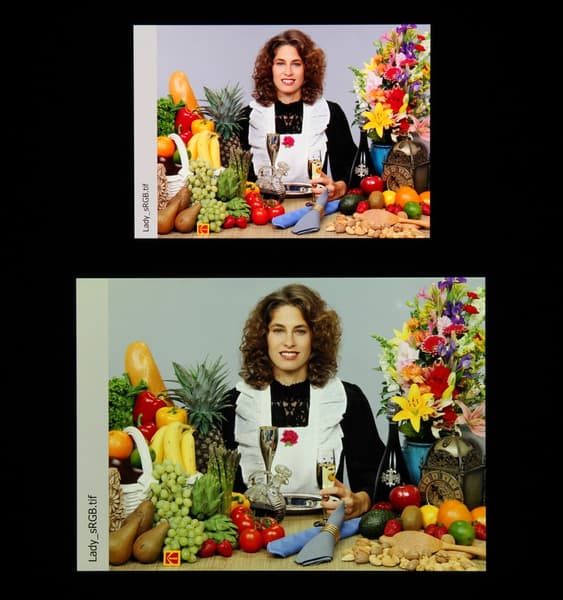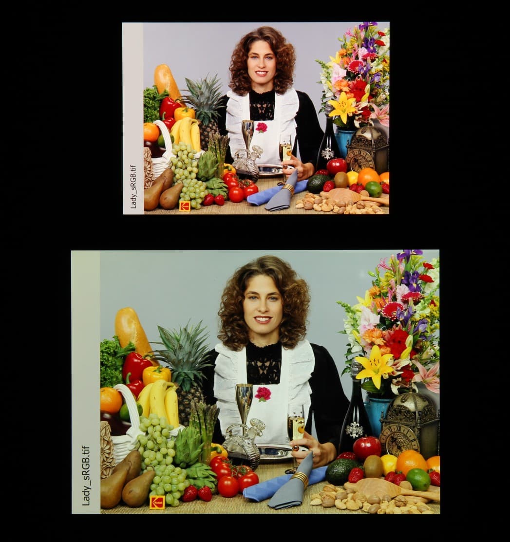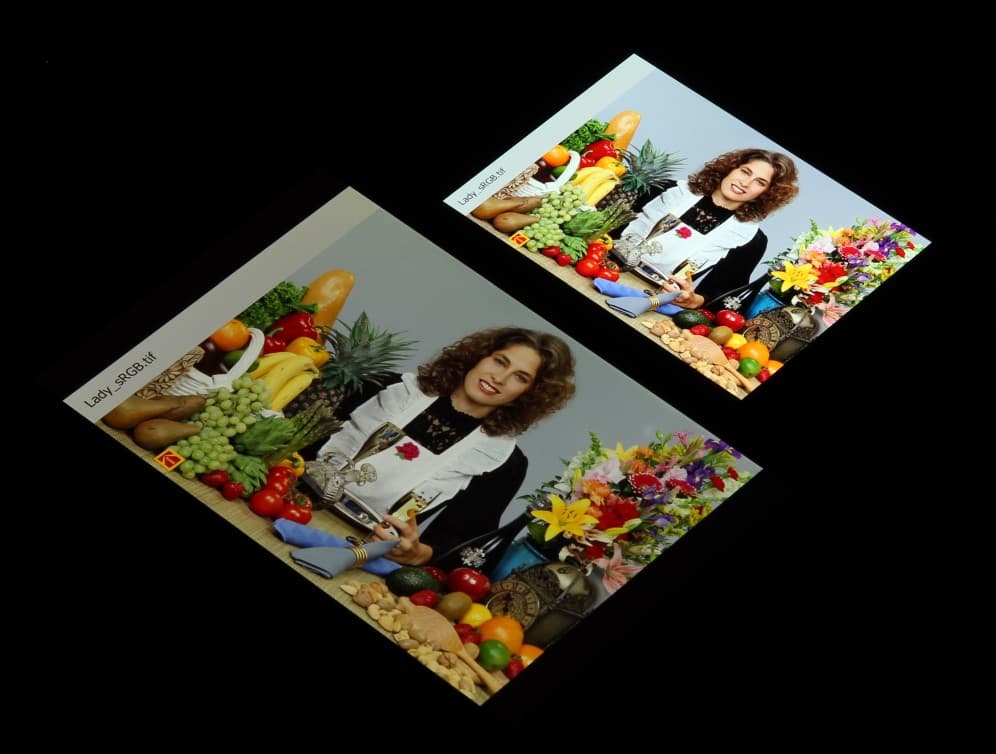 Отметим, что на экранах с широким цветовым охватом (без соответствующей коррекции) цвета́ обычных изображений, оптимизированных для устройств sRGB, выглядят неестественно насыщенными. Отсюда и рекомендация: в большинстве случаев смотреть кино, фотографии и все естественное лучше при выборе профиля Естественные цвета, и только если фотография или видеоматериал сделаны с охватом DCI, принятым в цифровом кинематографе, то имеет смысл переключить профиль на Насыщенные цвета.