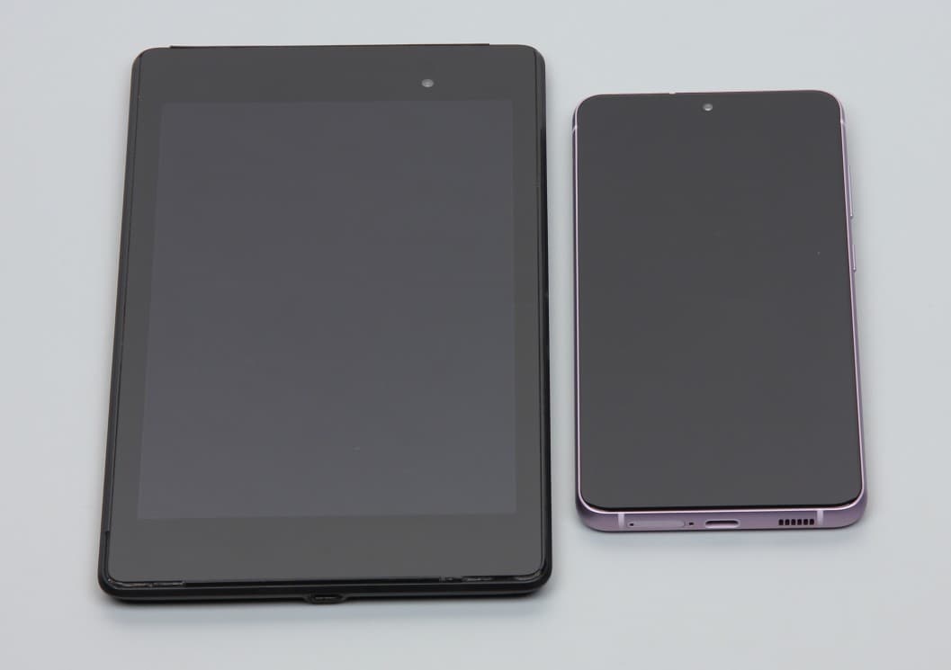 Лицевая поверхность экрана выполнена в виде стеклянной пластины с зеркально-гладкой поверхностью, устойчивой к появлению царапин. Судя по отражению объектов, антибликовые свойства экрана лучше, чем у экрана Google Nexus 7 (2013) (далее просто Nexus 7). Для наглядности приведем фотографию, на которой в выключенных экранах отражается белая поверхность (слева — Nexus 7, справа — Samsung Galaxy S21 FE, далее их можно различать по размеру):