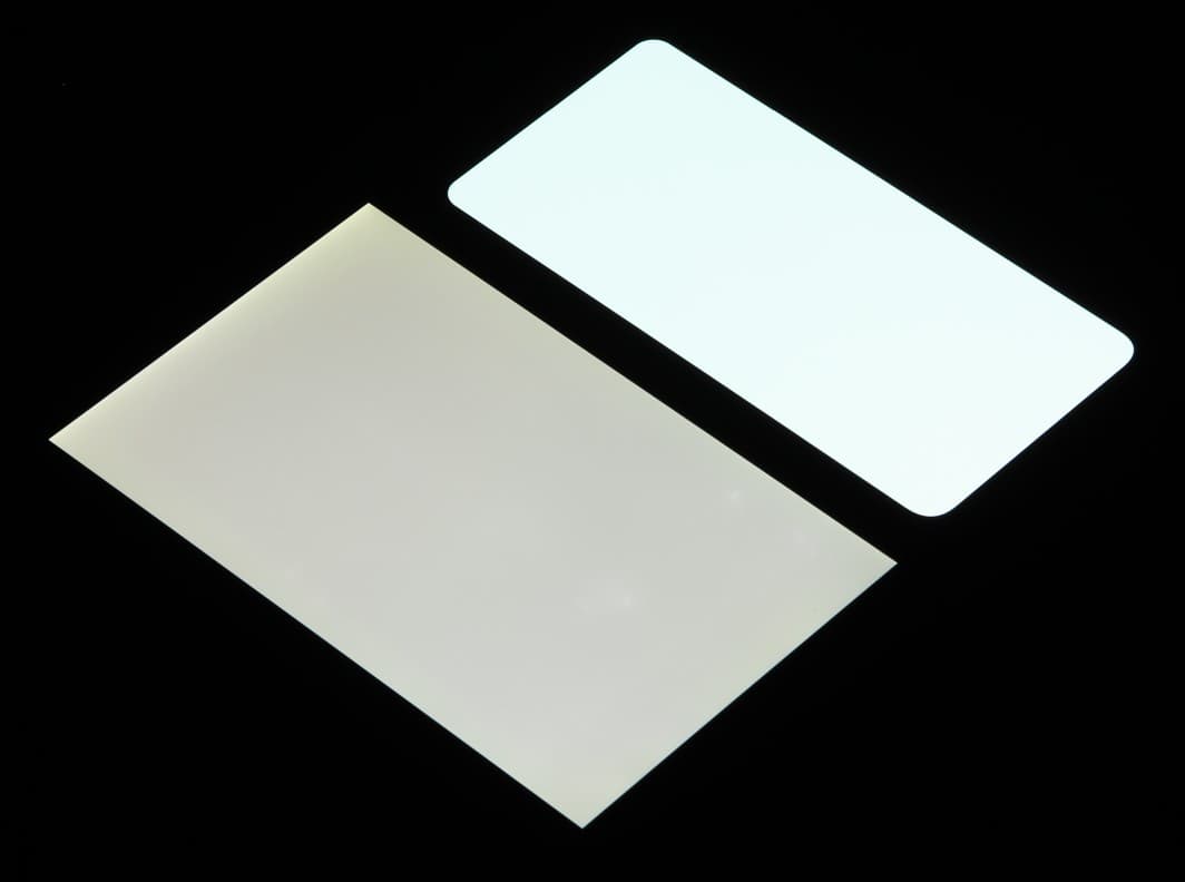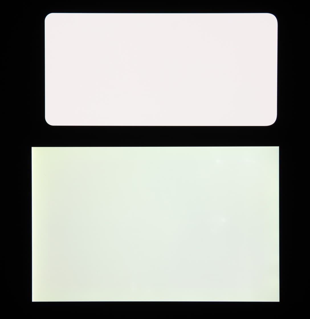 Экран характеризуется великолепными углами обзора. Правда, белый цвет при отклонении на большие углы приобретает легкий сине-зеленый оттенок, но черный цвет остается просто черным под любыми углами. Он настолько черный, что параметр контрастности в данном случае неприменим. Для сравнения приведем фотографии, на которых на экраны Samsung Galaxy S21 FE (профиль Насыщенные цвета) и второго участника сравнения выведены одинаковые изображения, при этом яркость экранов по белому полю изначально установлена примерно на 200 кд/м², а цветовой баланс на фотоаппарате принудительно переключен на 6500 К.