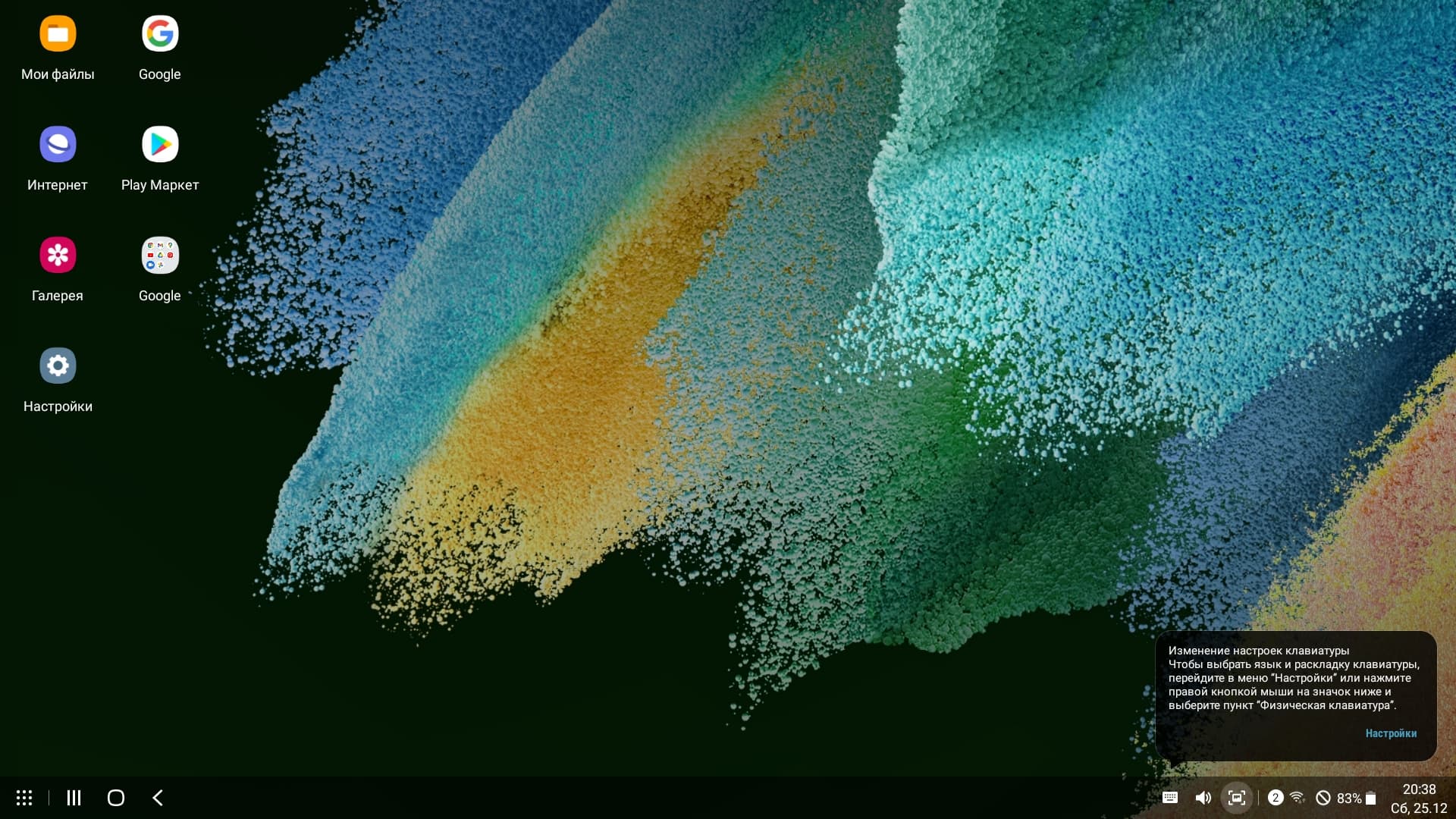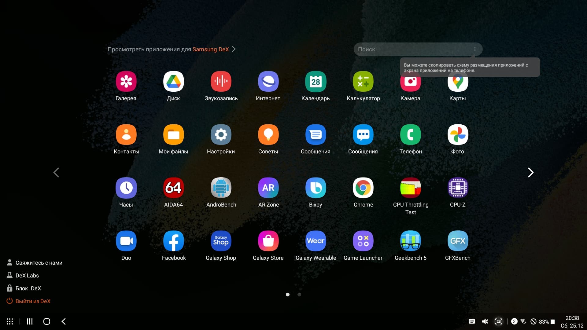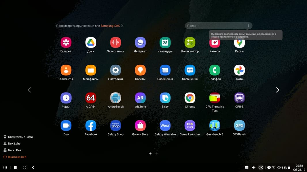 Оптимизированные для Samsung DeX приложения можно установить из фирменного магазина. Управляющая панель в нижней части экрана убирается при выводе изображения на весь экран (например, при воспроизведении видео). Вывод на монитор осуществляется в истинном разрешении 1920 на 1080 пикселей и точка в точку с кадровой частотой 60 Гц. Отметим, что одновременно с выводом изображения и звука можно по USB или по Bluetooth подключать к смартфону мышь и клавиатуру, превращая его в основу для рабочего места. Кроме того, читаются подключенные к адаптеру USB-накопители. Для физической клавиатуры поддерживаются переключение языка и ряд горячих сочетаний клавиш. Поддерживается также подключение к проводной сети на скорости 1 Гбит/с.