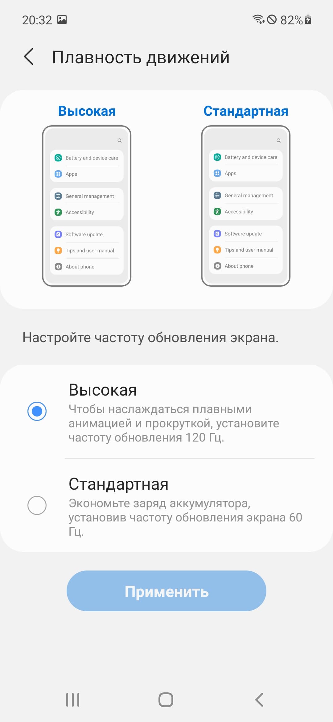 В настройках экрана можно включить режим с повышенной до 120 Гц частотой обновления. В этом режиме нам как минимум обещают увеличение плавности прокрутки.