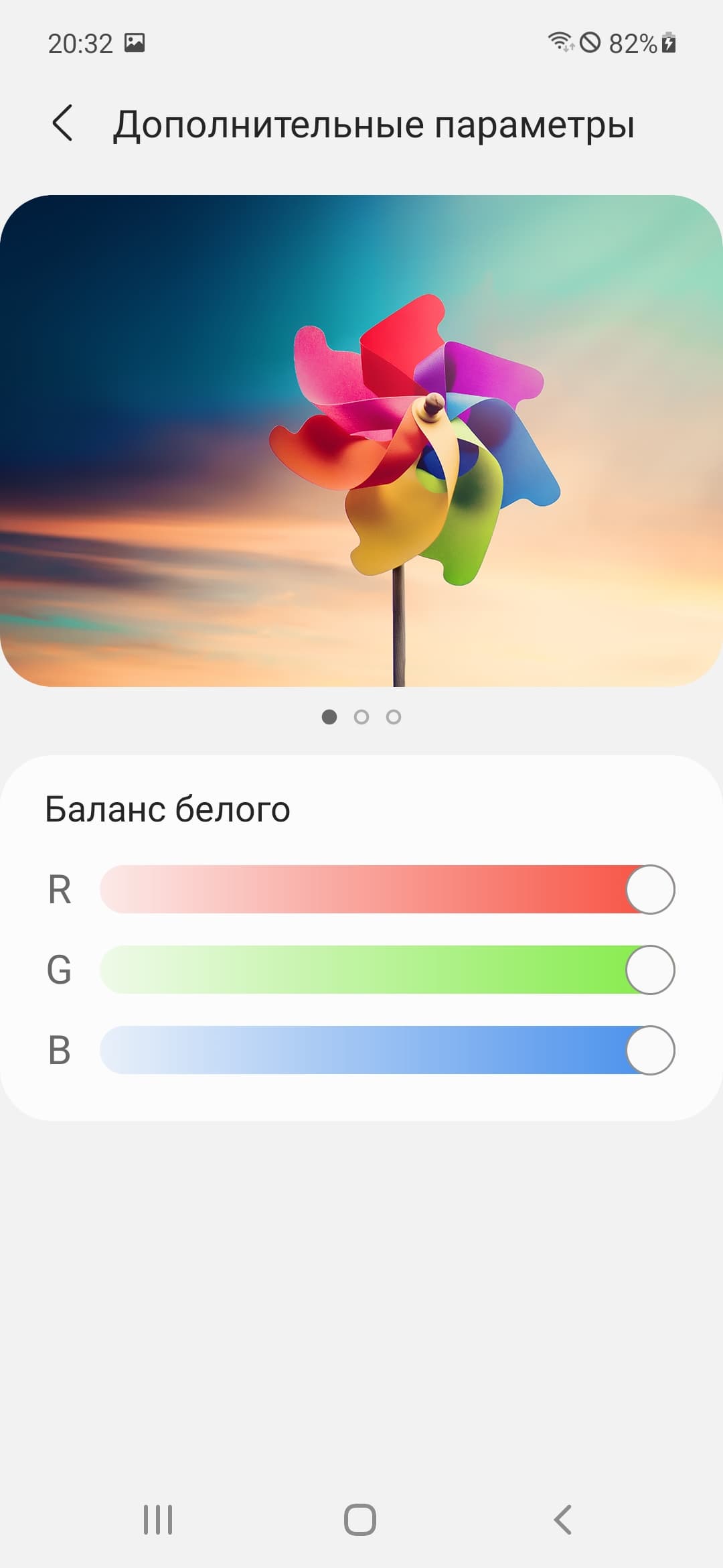 Почему-то только при выборе профиля Насыщенные цвета появляется возможность настройки цветового баланса регулировкой цветовой температуры и тремя регулировками интенсивности основных цветов, но из-за слишком широкого цветового охвата как раз в этом профиле нет смысла исправлять именно баланс.
