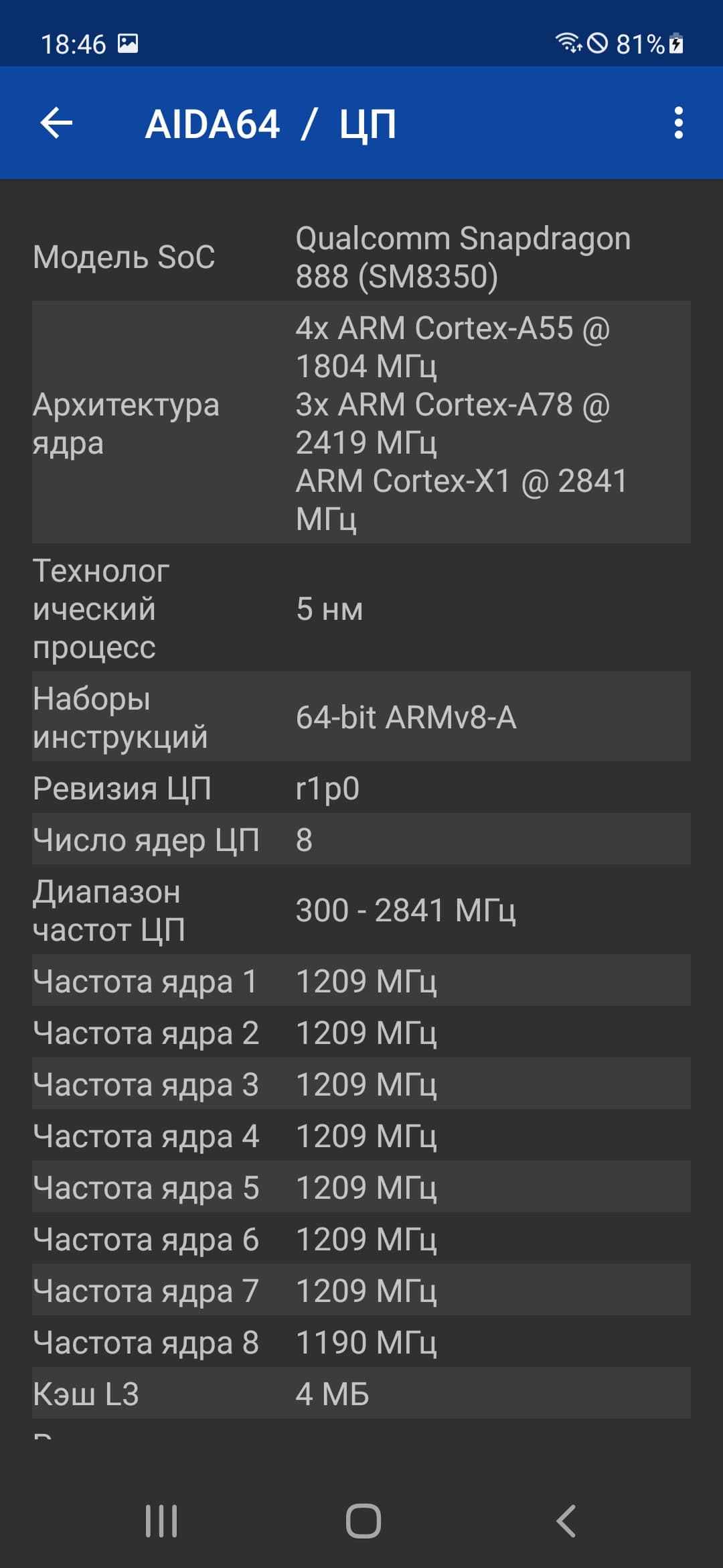 - SoC Qualcomm Snapdragon 888 5G, 8 процессорных ядер (1×Cortex-X1 @2,8 ГГц + 3×Cortex-A78 @2,4 ГГц + 4×Cortex-A55 @1,8 ГГц)