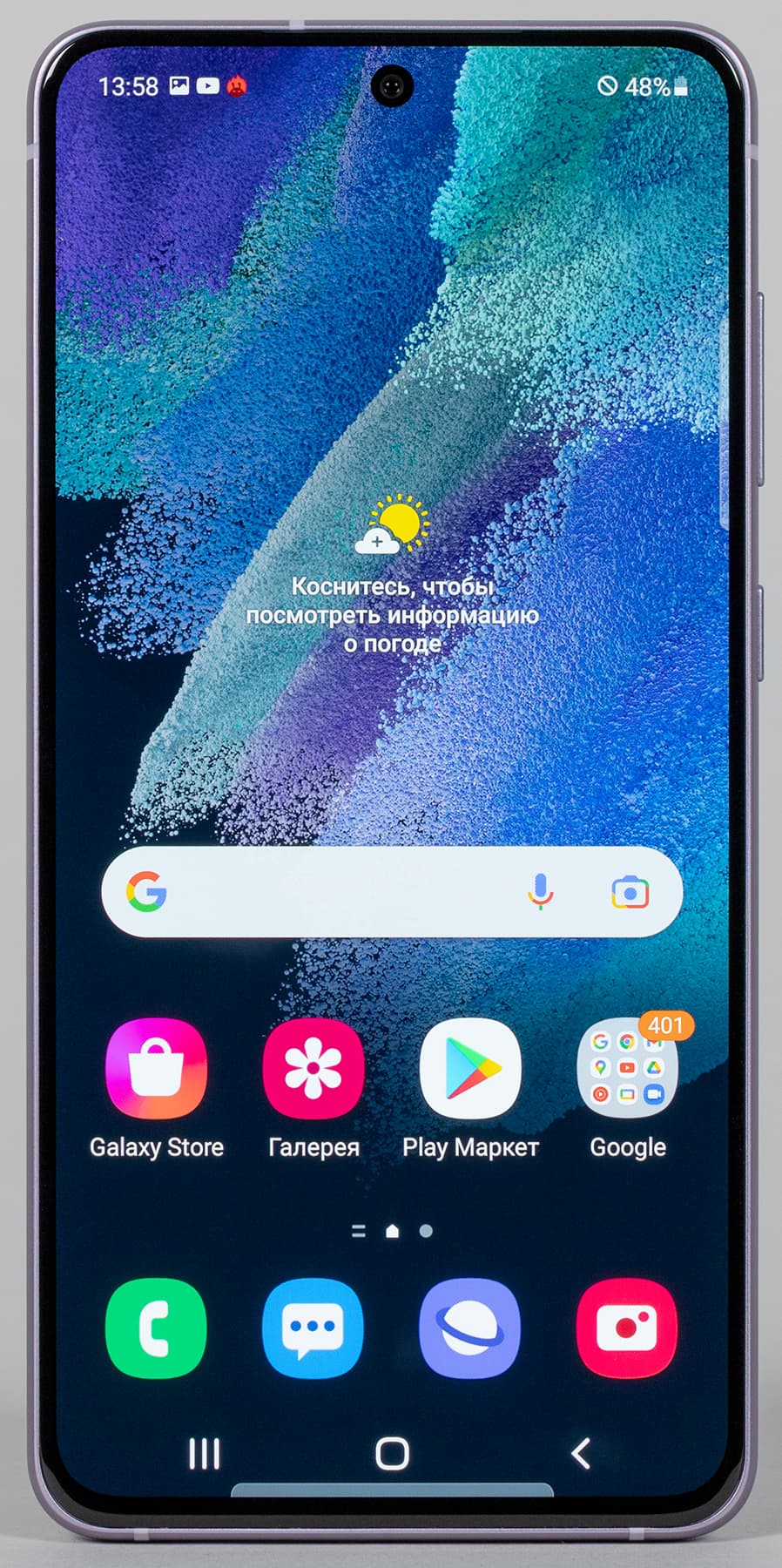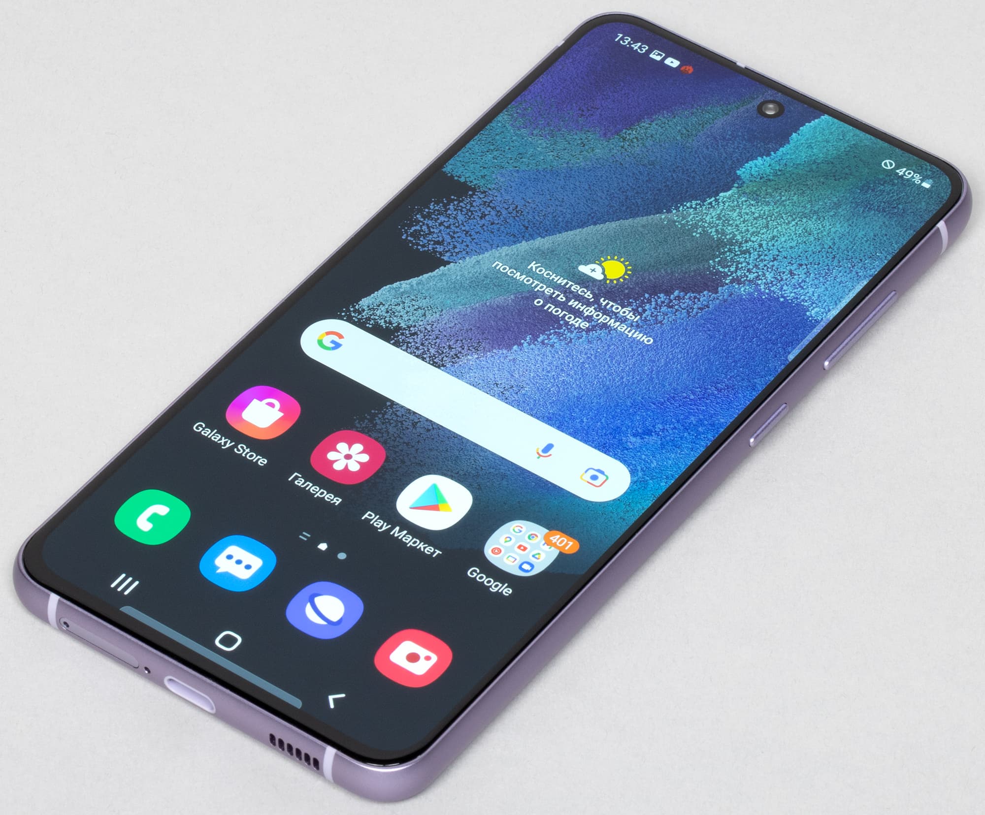 Экран у Samsung Galaxy S21 FE заметно темнее (яркость по фотографиям 73 против 87 у Nexus 7) и не имеет выраженного оттенка. Двоение отраженных объектов в экране Samsung Galaxy S21 FE очень слабое, это свидетельствует о том, что между слоями экрана нет воздушного промежутка. За счет меньшего числа границ (типа стекло/воздух) с сильно различающимися коэффициентами преломления экраны без воздушного промежутка лучше смотрятся в условиях интенсивной внешней засветки, но вот их ремонт в случае потрескавшегося внешнего стекла обходится гораздо дороже, так как менять приходится экран целиком. На внешней поверхности экрана Samsung Galaxy S21 FE есть специальное олеофобное (жироотталкивающее) покрытие (очень эффективное, гораздо лучше, чем у Nexus 7), поэтому следы от пальцев удаляются существенно легче, а появляются с меньшей скоростью, чем в случае обычного стекла.