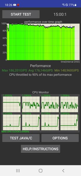 Тестирование традиционно проводилось на обычном уровне энергопотребления без использования функций энергосбережения, хотя таковые в аппарате имеются. Условия тестирования: выставлен минимальный комфортный уровень яркости (примерно 100 кд/м²). Тесты: беспрерывное чтение в программе Moon+ Reader (со стандартной, светлой темой); беспрерывный просмотр видео в HD-качестве (720р) через домашнюю сеть Wi-Fi; игра Injustice 2 с автонастройками графики.