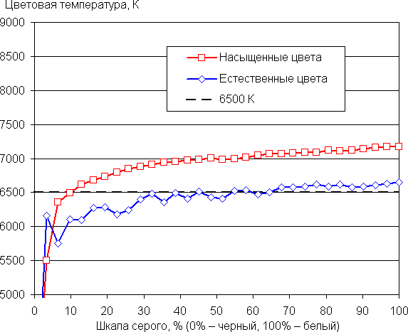 Баланс оттенков на шкале серого хороший. Цветовая температура, особенно после выбора профиля Естественные цвета близка к 6500 К, при этом на значимом участке шкалы серого этот параметр изменяется не очень сильно, что улучшает визуальное восприятие баланса цветов. Отклонение от спектра абсолютно черного тела (ΔE) на большей части шкалы серого остается ниже 10 единиц, что для потребительского устройства считается хорошим показателем, и разброс этой характеристики также не очень большой: