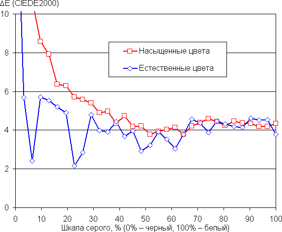 (Самые темные области шкалы серого в большинстве случаев можно не учитывать, так как там баланс цветов не имеет большого значения, да и погрешность измерений цветовых характеристик на низкой яркости большая.)