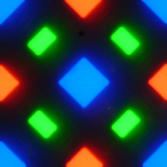 В этом экране используется матрица Super AMOLED — активная матрица на органических светодиодах. Полноцветное изображение создается с помощью субпикселей трех цветов — красного (R), зеленого (G) и синего (B), но красных и синих субпикселей в два раза меньше, что можно обозначить как RGBG. Это подтверждается фрагментом микрофотографии:
