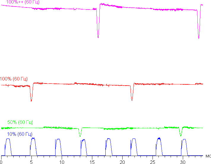 Видно, что на высокой (как «100%++» мы обозначили режим с дополнительной засветкой датчика освещенности ярким светом) и средней яркости амплитуда модуляции не очень большая (точнее скважность явно низкая), в итоге видимого мерцания нет. Однако при сильном понижении яркости появляется модуляция с большой относительной амплитудой и высокой скважностью, ее наличие уже можно увидеть в тесте на присутствие стробоскопического эффекта или просто при быстром движении глаз. В зависимости от индивидуальной чувствительности такое мерцание может вызывать повышенную утомляемость. Впрочем, фаза модуляции различается по площади экрана, поэтому негативный эффект от мерцания снижен.