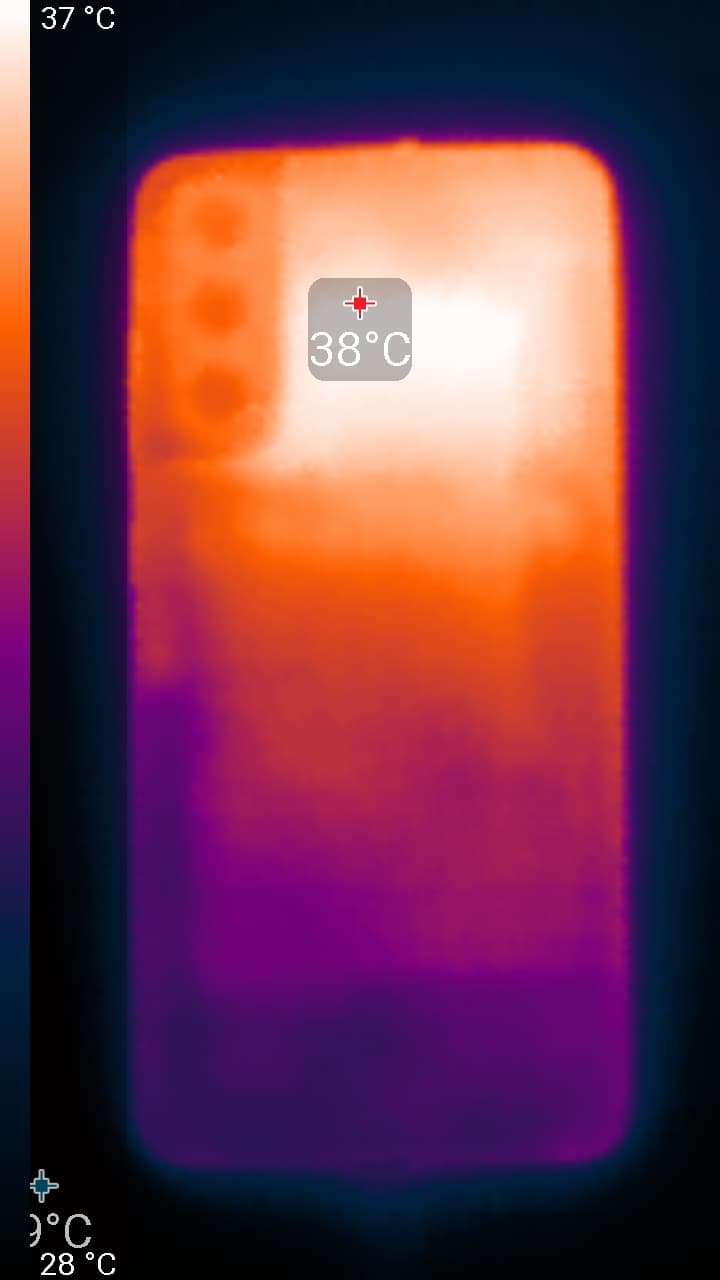 Нагрев выше в верхней части, что, видимо, соответствует расположению микросхемы SoC. По данным теплокамеры, максимальный нагрев составил 38 градусов (при температуре окружающего воздуха в 24 градуса), это не очень много.