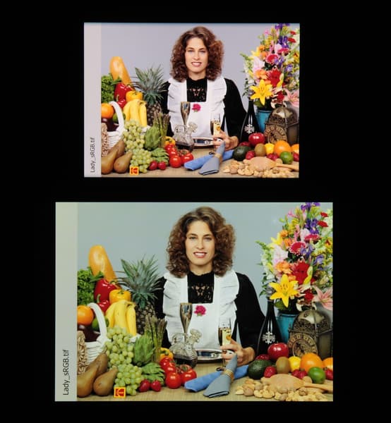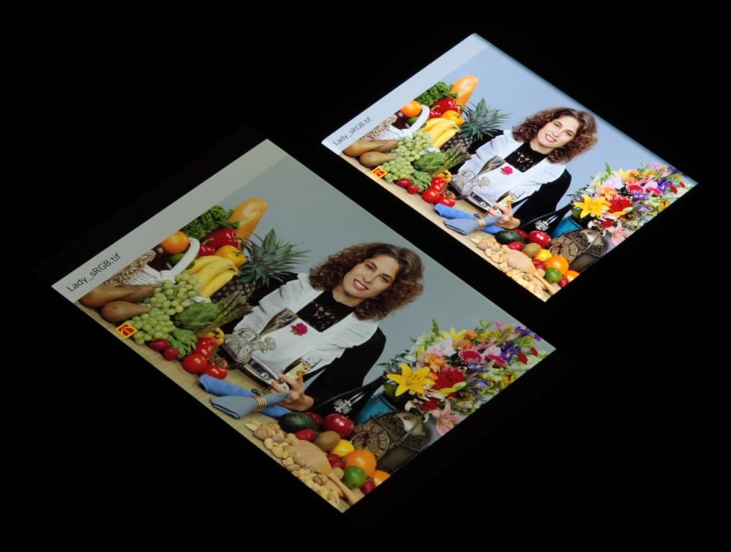 Отметим, что на экранах с широким цветовым охватом (без соответствующей коррекции) цвета́ обычных изображений, оптимизированных для устройств sRGB, выглядят неестественно насыщенными. Отсюда и рекомендация: в большинстве случаев смотреть кино, фотографии и все естественное лучше при выборе профиля Естественные цвета, и только если фотография или видеоматериал сделаны с охватом DCI, принятым в цифровом кинематографе, то имеет смысл переключить профиль на Насыщенные цвета.