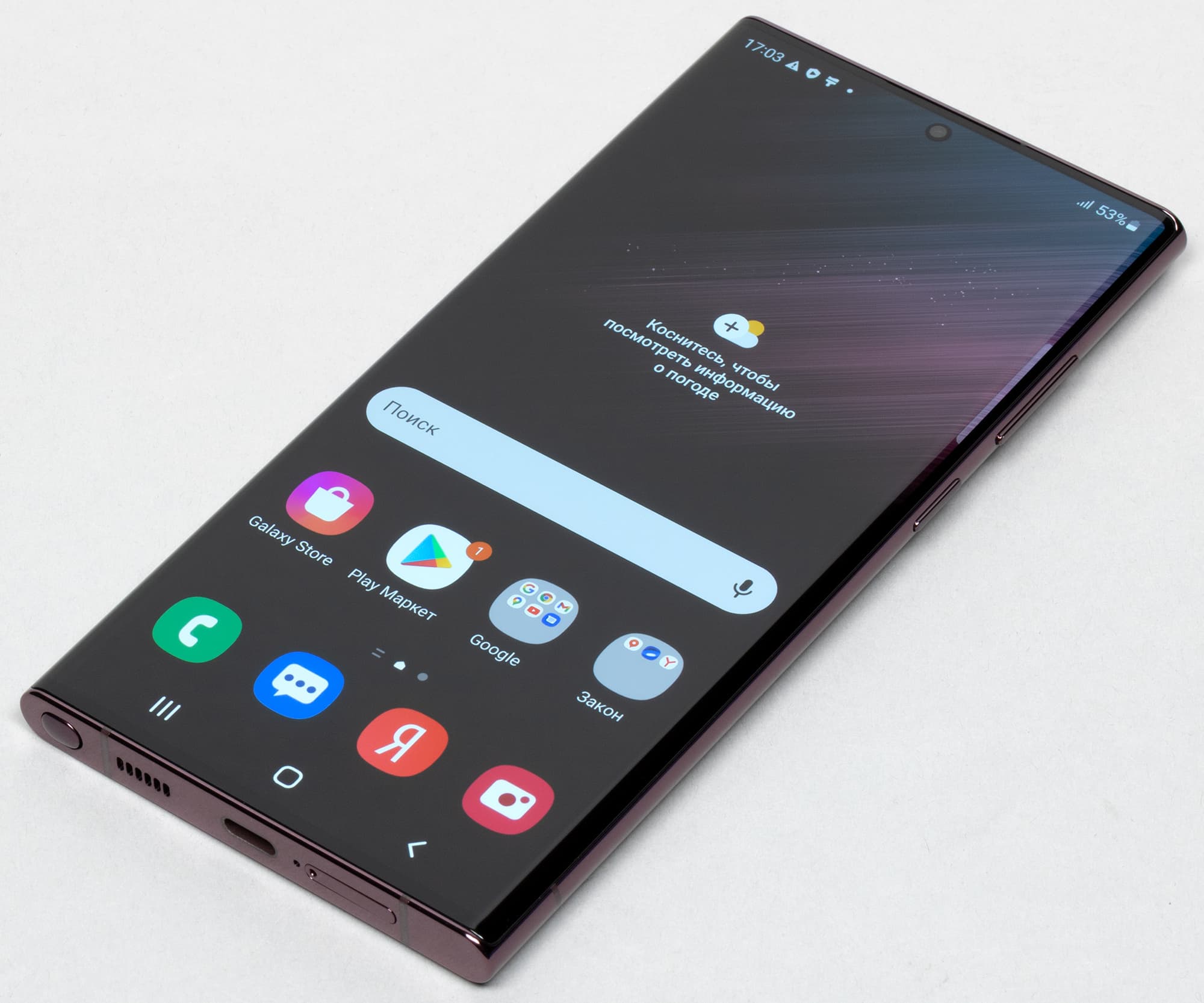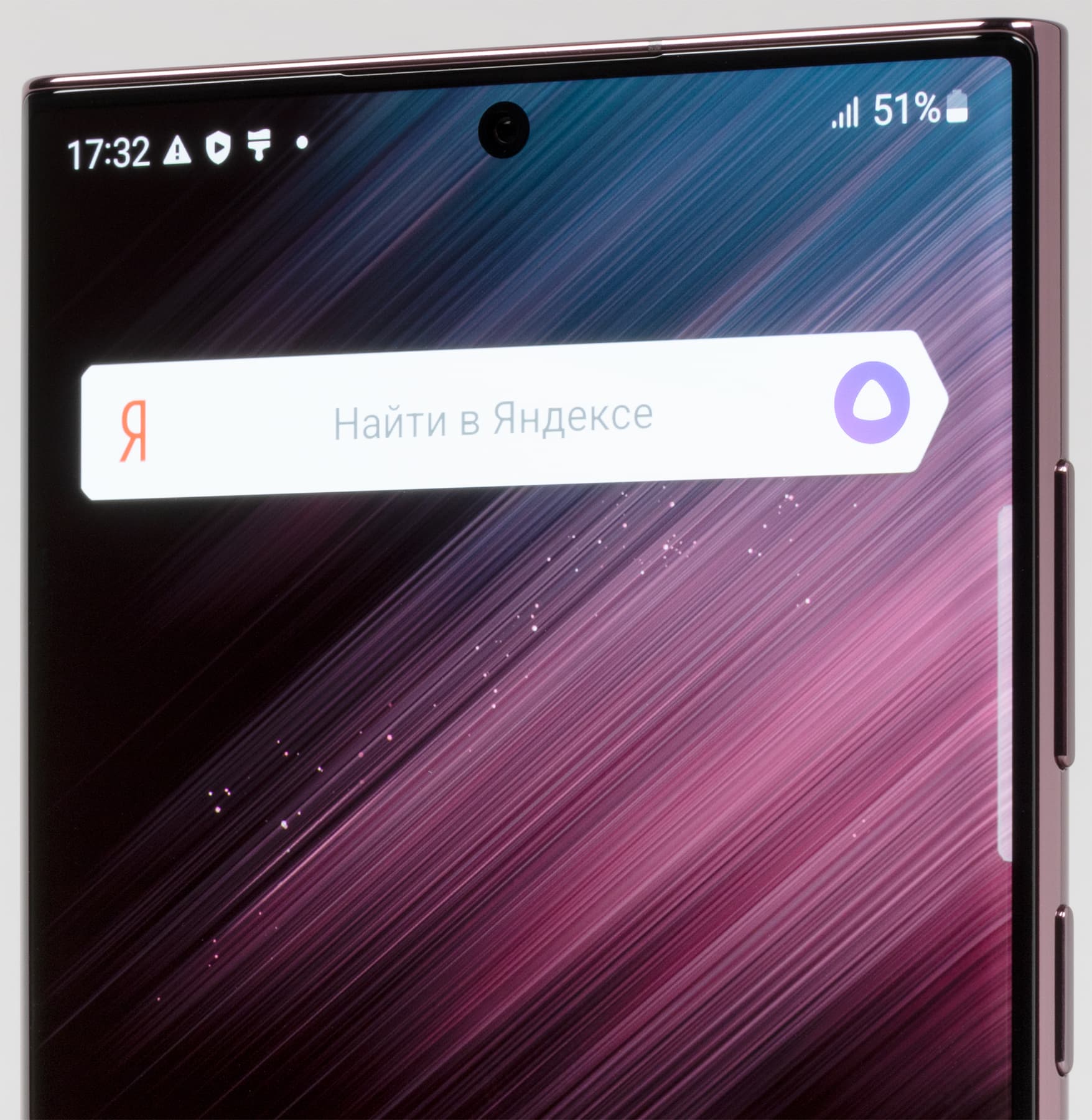 Цветопередача хорошая, цвета в меру насыщенные, цветовой баланс у экранов немного различается. Напомним, что фотография не может служить надежным источником сведений о качестве цветопередачи и приводится только для условной наглядной иллюстрации. В частности, выраженный красноватый оттенок белого и серого полей, присутствующий на фотографиях экрана Samsung Galaxy S22 Ultra, при перпендикулярном взгляде визуально отсутствует, что подтверждается аппаратными тестами с помощью спектрофотометра. Причина в том, что спектральная чувствительность матрицы фотоаппарата неточно совпадает с этой характеристикой человеческого зрения. Заметим, что в данном случае картинка занимает в высоту (при ландшафтной ориентации экрана) всю доступную для вывода изображения область и заходит на загнутые края экрана, что приводит к легкому затемнению и искажению цвета. Также на свету эти области почти всегда бликуют, что еще больше мешает при просмотре изображений, выведенных на весь экран. И даже картинка фильмов с соотношением сторон 16:9 заходит на загибы, что мешает при просмотре кино.