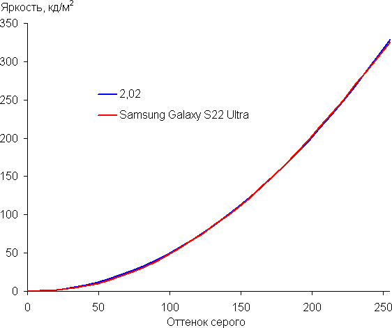 Напомним, что в случае OLED-экранов яркость фрагментов изображения динамично меняется в соответствии с характером выводимого изображения — уменьшается для светлых в целом изображений. В итоге полученная зависимость яркости от оттенка (гамма-кривая), скорее всего, немного не соответствует гамма-кривой статичного изображения, так как измерения проводились при последовательном выводе оттенков серого почти на весь экран.