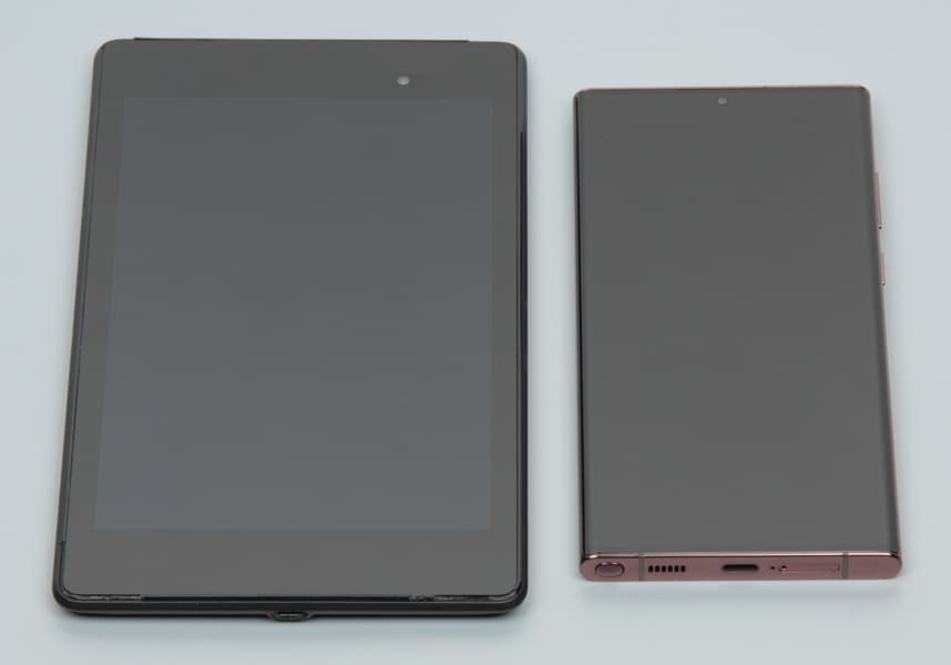 Лицевая поверхность экрана выполнена в виде стеклянной пластины с зеркально-гладкой поверхностью, устойчивой к появлению царапин. Судя по отражению объектов, антибликовые свойства экрана лучше, чем у экрана Google Nexus 7 (2013) (далее просто Nexus 7). Для наглядности приведем фотографию, на которой в выключенных экранах отражается белая поверхность (слева — Nexus 7, справа — Samsung Galaxy S22 Ultra, далее их можно различать по размеру):