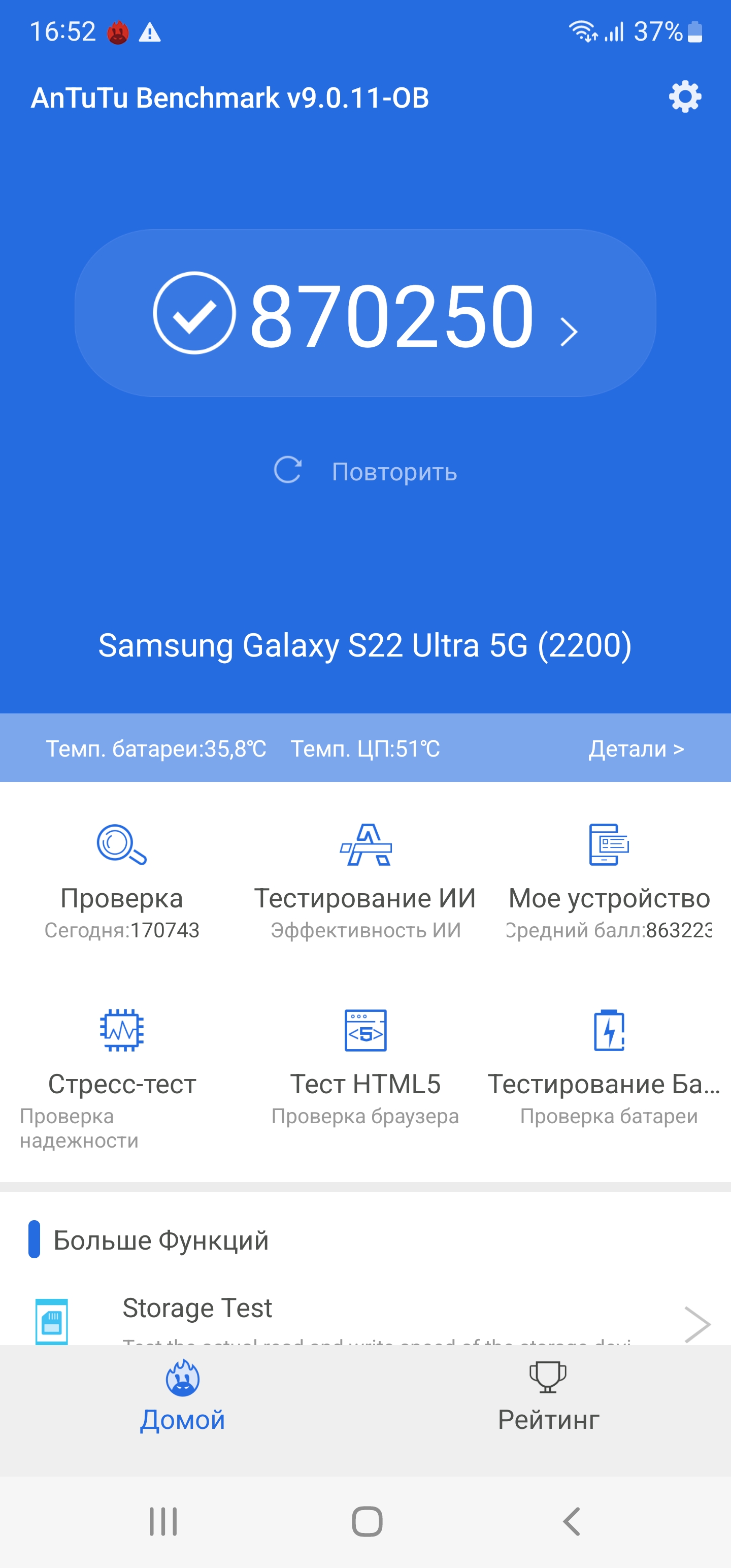 SoC Exynos 2200 производится по техпроцессу 4 нм. Смартфон демонстрирует высочайшие результаты в синтетических тестах, выше, чем у Qualcomm Snapdragon 888. Соответственно, и в реальной эксплуатации недостатка в производительности пользователь не ощутит. Анимации интерфейса плавные, приложения открываются без задержек, игры идут без видимых притормаживаний на высоких настройках графики.