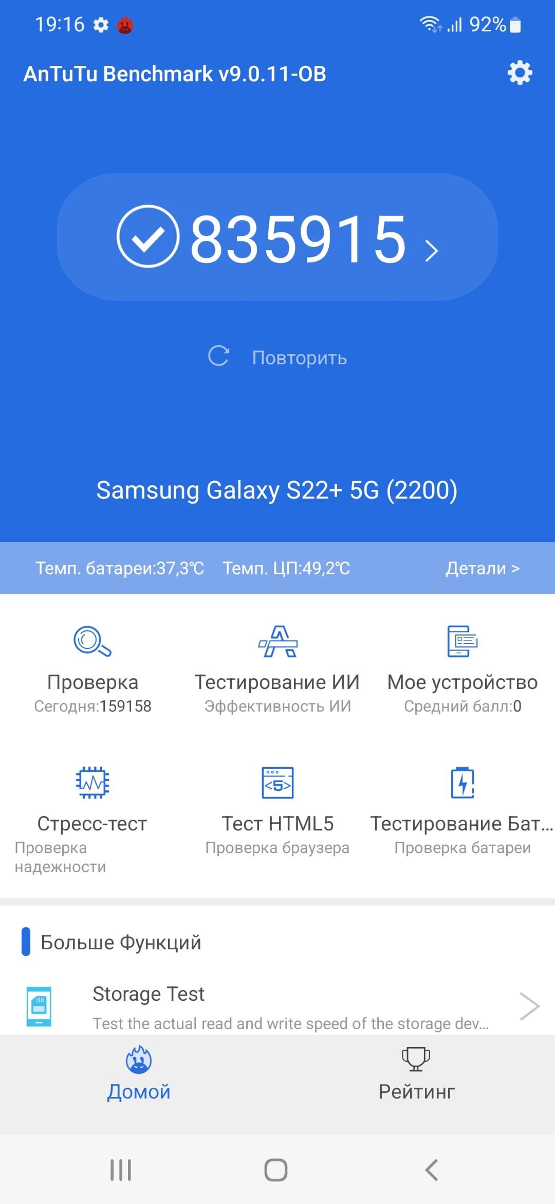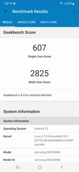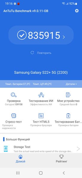 SoC Exynos 2200 выполнена с соблюдением техпроцесса 4 нм. Смартфон демонстрирует высочайшие результаты в синтетических тестах, выше, чем у Qualcomm Snapdragon 888. Соответственно, и в реальной эксплуатации недостатка в производительности пользователь не ощутит. Интерфейс плавный, приложения открываются без задержек, игры идут без видимых притормаживаний на высоких настройках графики.