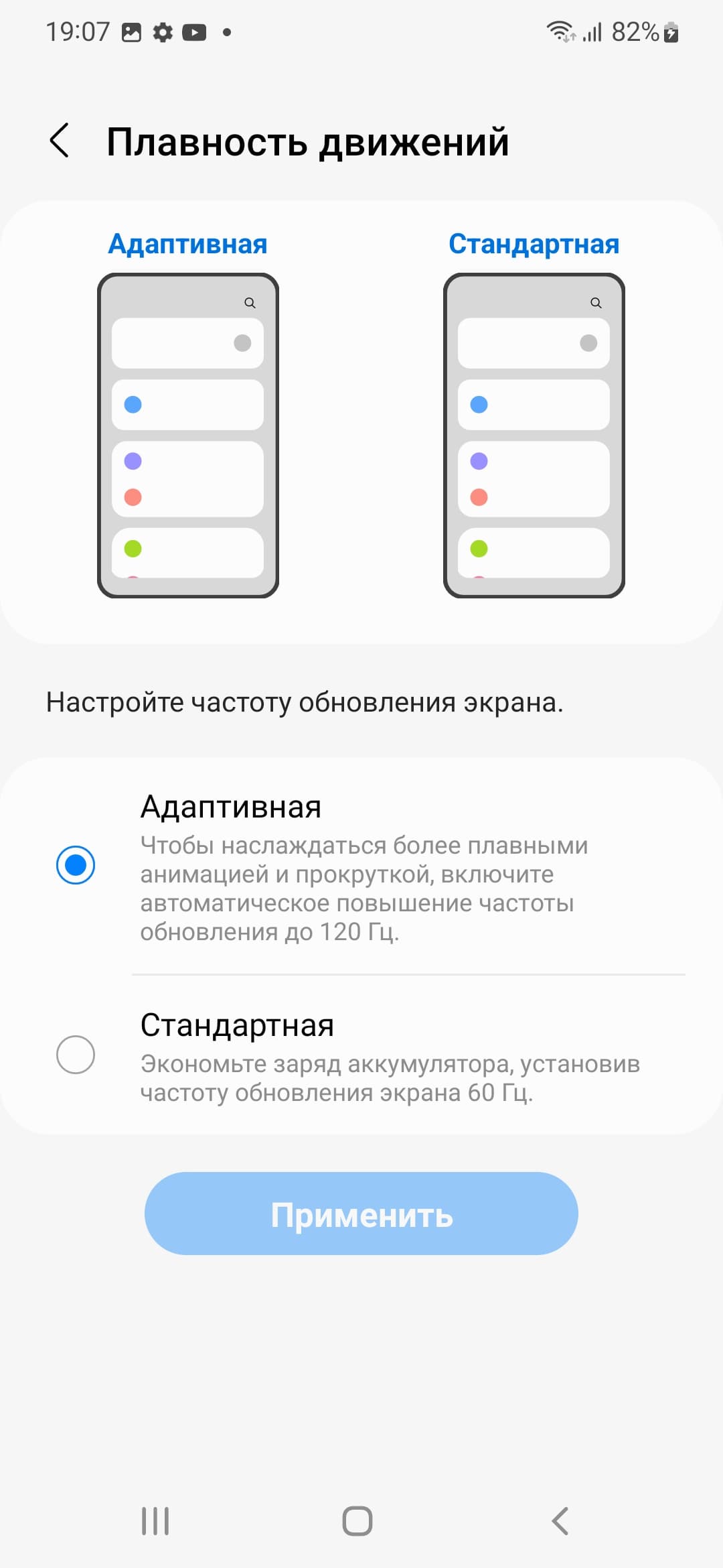 В настройках экрана можно включить адаптивный режим с повышенной до 120 Гц частотой обновления. В этом режиме нам как минимум обещают увеличение плавности прокрутки.