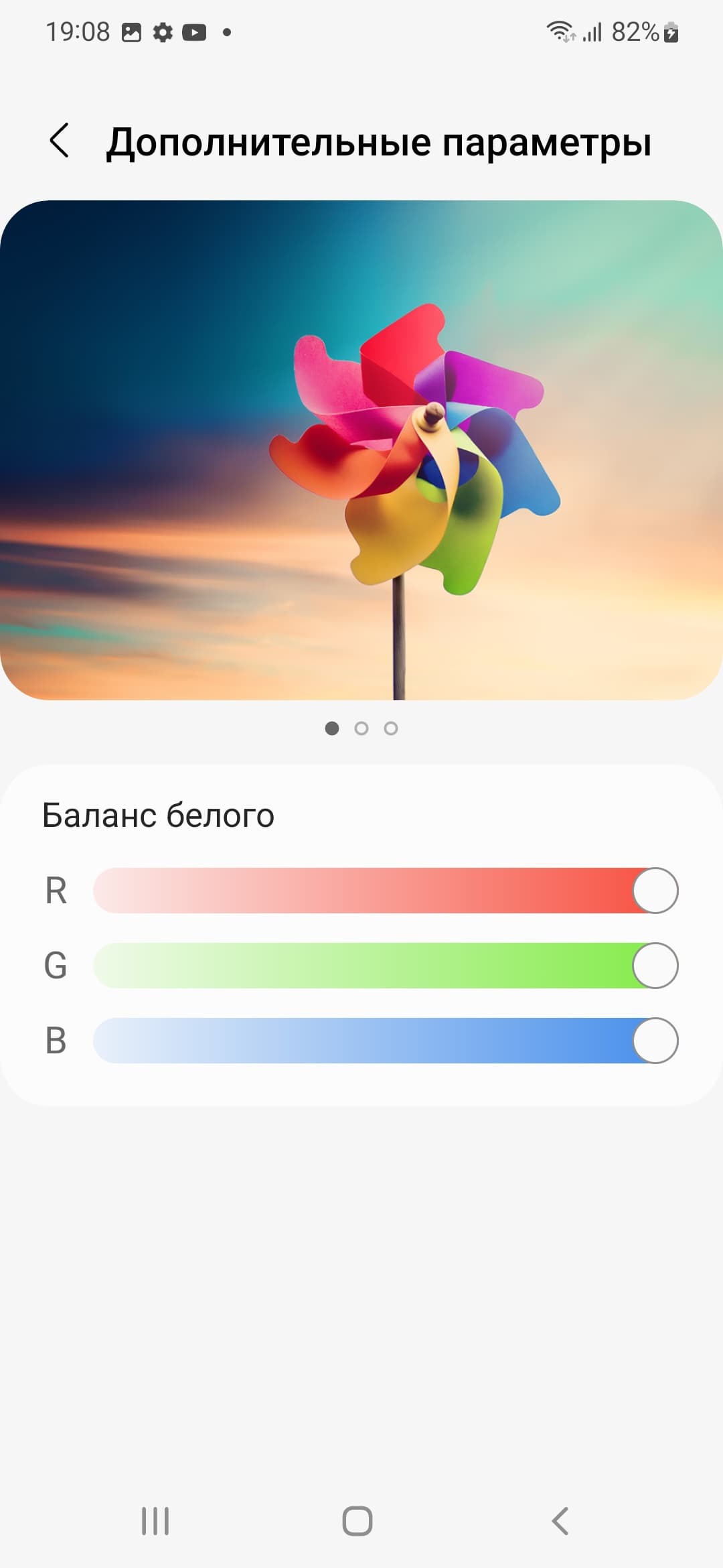 Почему-то только при выборе профиля Насыщенные цвета появляется возможность настройки цветового баланса регулировкой цветовой температуры и тремя регулировками интенсивности основных цветов, но из-за слишком широкого цветового охвата как раз в этом профиле нет смысла исправлять именно баланс.