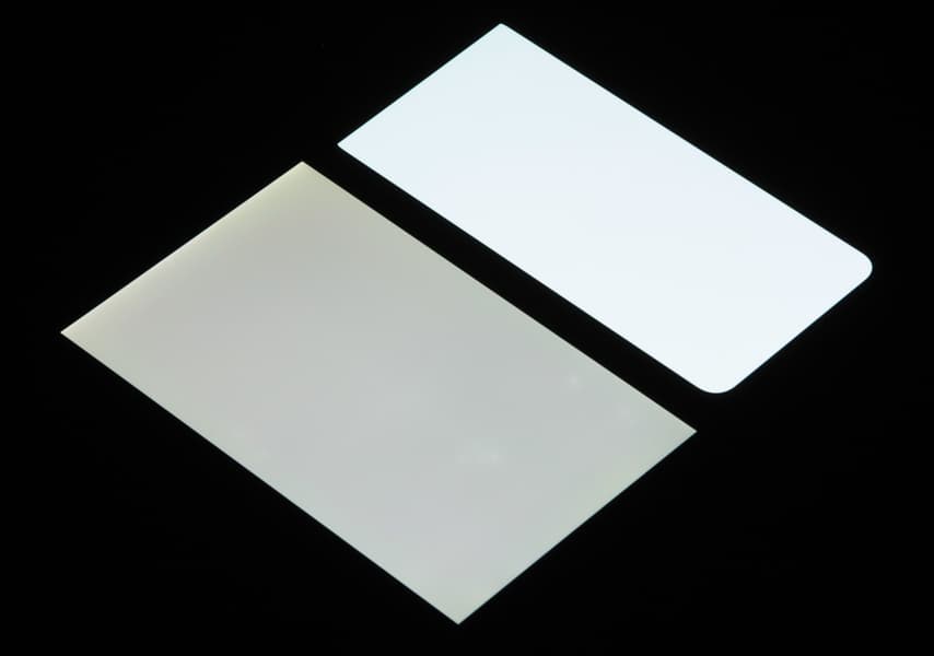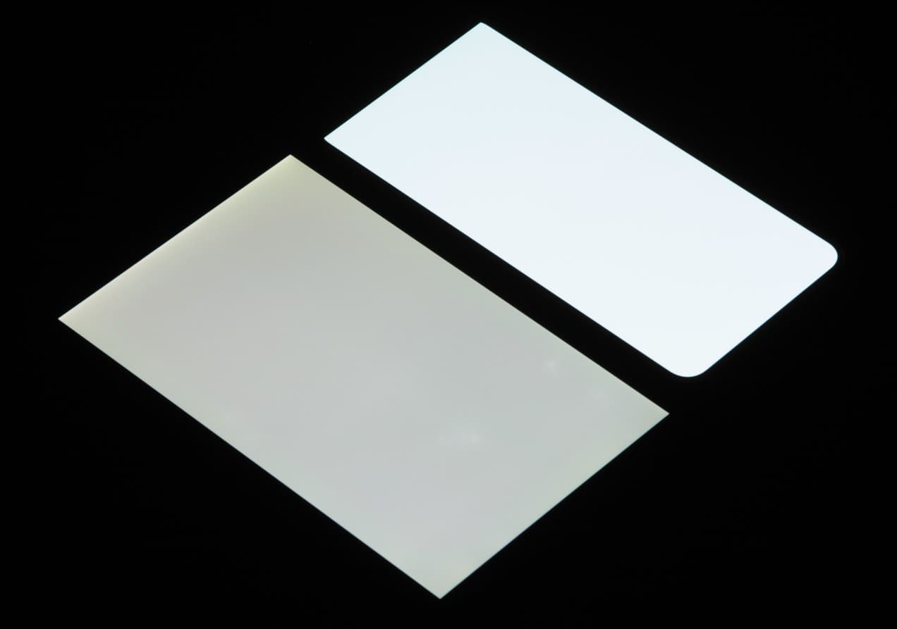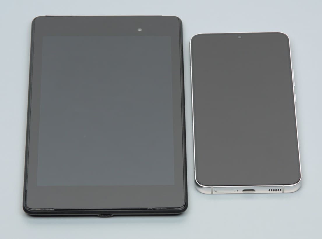 Лицевая поверхность экрана выполнена в виде стеклянной пластины с зеркально-гладкой поверхностью, устойчивой к появлению царапин. Судя по отражению объектов, антибликовые свойства экрана лучше, чем у экрана Google Nexus 7 (2013) (далее просто Nexus 7). Для наглядности приведем фотографию, на которой в выключенных экранах отражается белая поверхность (слева — Nexus 7, справа — Samsung Galaxy S22+, далее их можно различать по размеру):