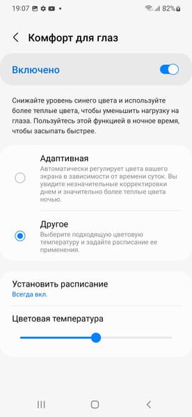 Есть функция Комфорт для глаз, для которой в настройках даже приведено белее-менее корректное описание. Напомним, что, в принципе, яркий свет может приводить к нарушению суточного (циркадного) ритма (см. статью про iPad Pro с дисплеем 9,7 дюйма), но все решается снижением яркости до низкого, но еще комфортного уровня, а искажать цветовой баланс, уменьшая вклад синего, нет абсолютно никакого смысла.
