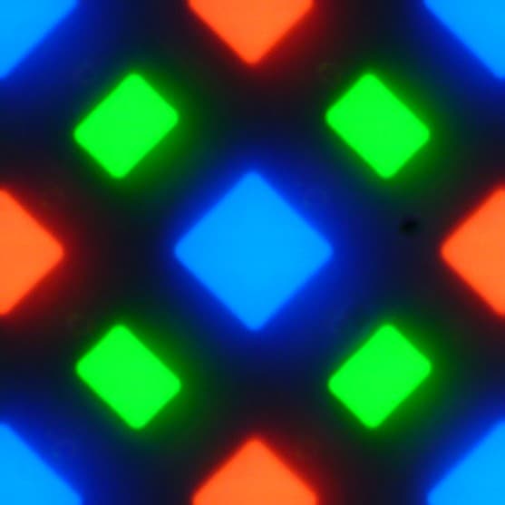 В этом экране используется матрица Super AMOLED — активная матрица на органических светодиодах. Полноцветное изображение создается с помощью субпикселей трех цветов — красного (R), зеленого (G) и синего (B), но красных и синих субпикселей в два раза меньше, что можно обозначить как RGBG. Это подтверждается фрагментом микрофотографии: