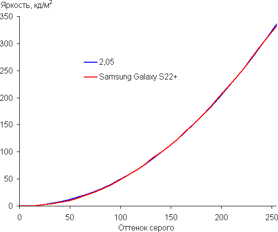 Напомним, что в случае OLED-экранов яркость фрагментов изображения динамично меняется в соответствии с характером выводимого изображения — уменьшается для светлых в целом изображений. В итоге полученная зависимость яркости от оттенка (гамма-кривая), скорее всего, немного не соответствует гамма-кривой статичного изображения, так как измерения проводились при последовательном выводе оттенков серого почти на весь экран.