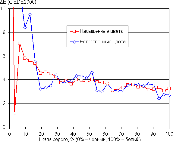 Баланс оттенков на шкале серого хороший. Цветовая температура, особенно после выбора профиля Естественные цвета близка к 6500 К, при этом на значимом участке шкалы серого этот параметр изменяется не очень сильно, что улучшает визуальное восприятие баланса цветов. Отклонение от спектра абсолютно черного тела (ΔE) на большей части шкалы серого остается ниже 10 единиц, что для потребительского устройства считается хорошим показателем, и разброс этой характеристики также не очень большой: