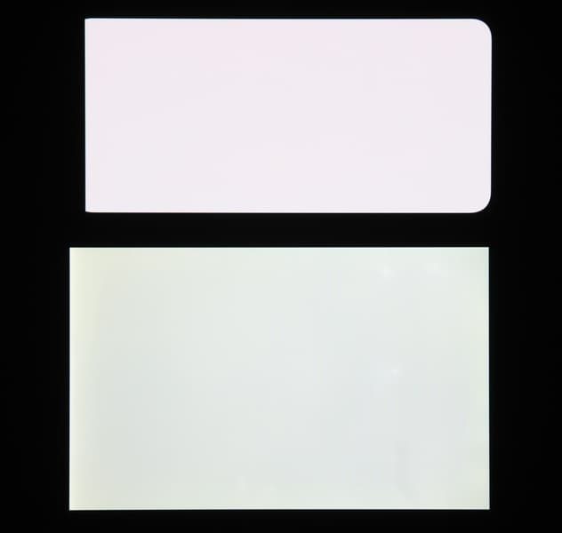 Экран характеризуется великолепными углами обзора. Правда, белый цвет при отклонении на большие углы приобретает легкий сине-зеленый оттенок, но черный цвет остается просто черным под любыми углами. Он настолько черный, что параметр контрастности в данном случае неприменим. Для сравнения приведем фотографии, на которых на экраны Samsung Galaxy S22+ (профиль Насыщенные цвета) и второго участника сравнения выведены одинаковые изображения, при этом яркость экранов по белому полю изначально установлена примерно на 200 кд/м², а цветовой баланс на фотоаппарате принудительно переключен на 6500 К.