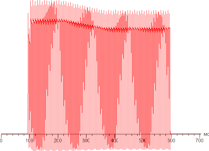 Переключение состояния элементов матрицы выполняется практически мгновенно, но на фронте включения может присутствовать ступенька шириной от примерно 8,3 мс (частота обновления 120 Гц) до 20,8 мс (частота обновления 48 Гц). Например, так выглядит зависимость яркости от времени при переходе от черного к белому и обратно (режим с частотой обновления 120 Гц):