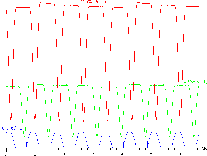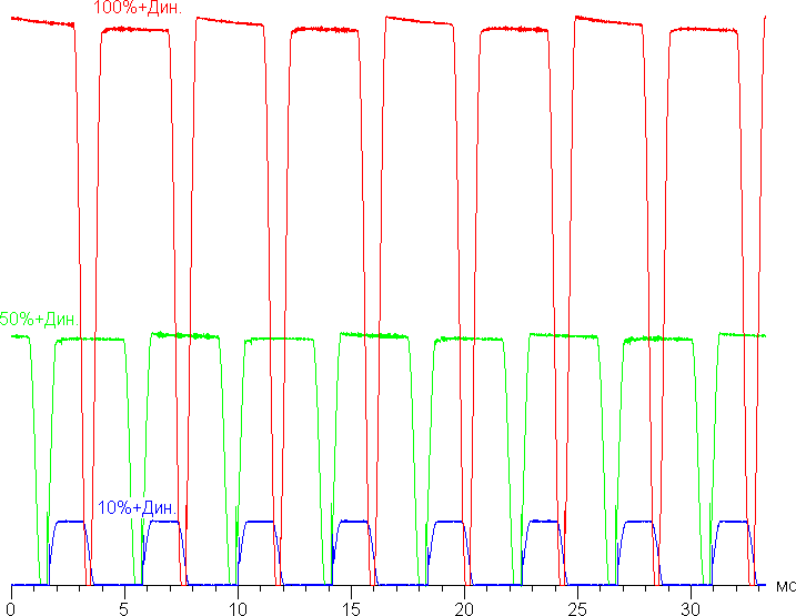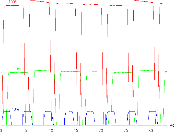 Видно, что на высокой и средней яркости амплитуда модуляции довольно большая, но скважность низкая, в итоге видимого мерцания нет. Однако при сильном понижении яркости появляется модуляция с большой относительной амплитудой и высокой скважностью, ее наличие уже можно увидеть в тесте на присутствие стробоскопического эффекта или просто при быстром движении глаз. В зависимости от индивидуальной чувствительности такое мерцание может вызывать повышенную утомляемость. Впрочем, фаза модуляции различается по площади экрана, поэтому негативный эффект от мерцания снижен.