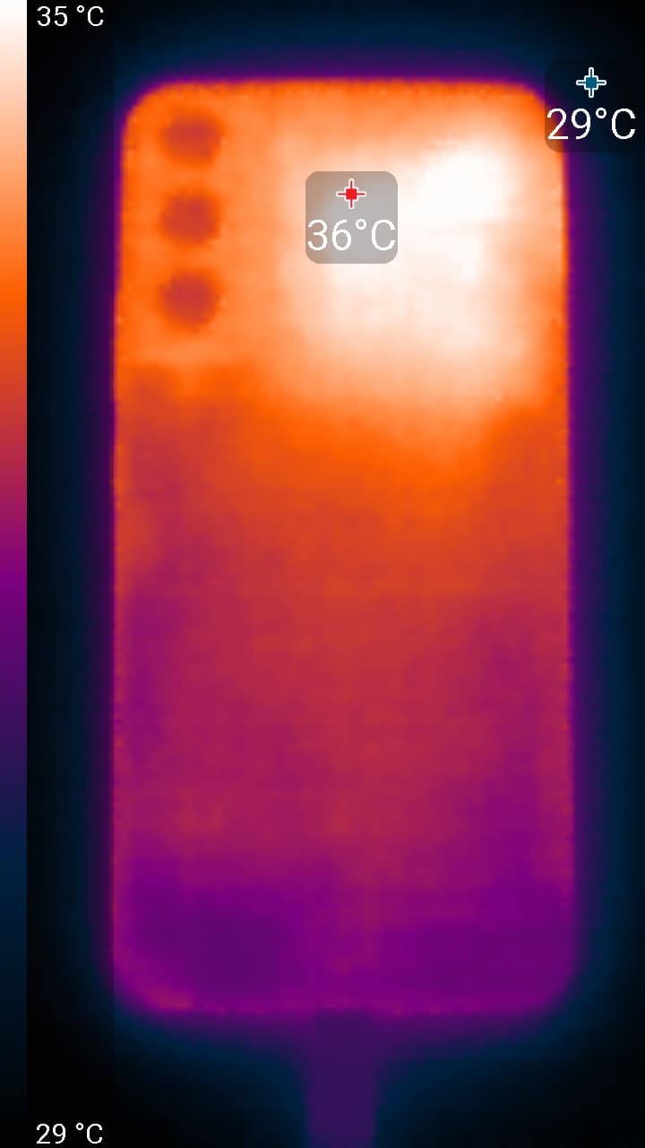 Нагрев выше в верхней части, что, видимо, соответствует расположению микросхемы SoC. По данным теплокамеры, максимальный нагрев составил всего 36 градусов (при температуре окружающего воздуха в 24 градуса), это относительно немного.