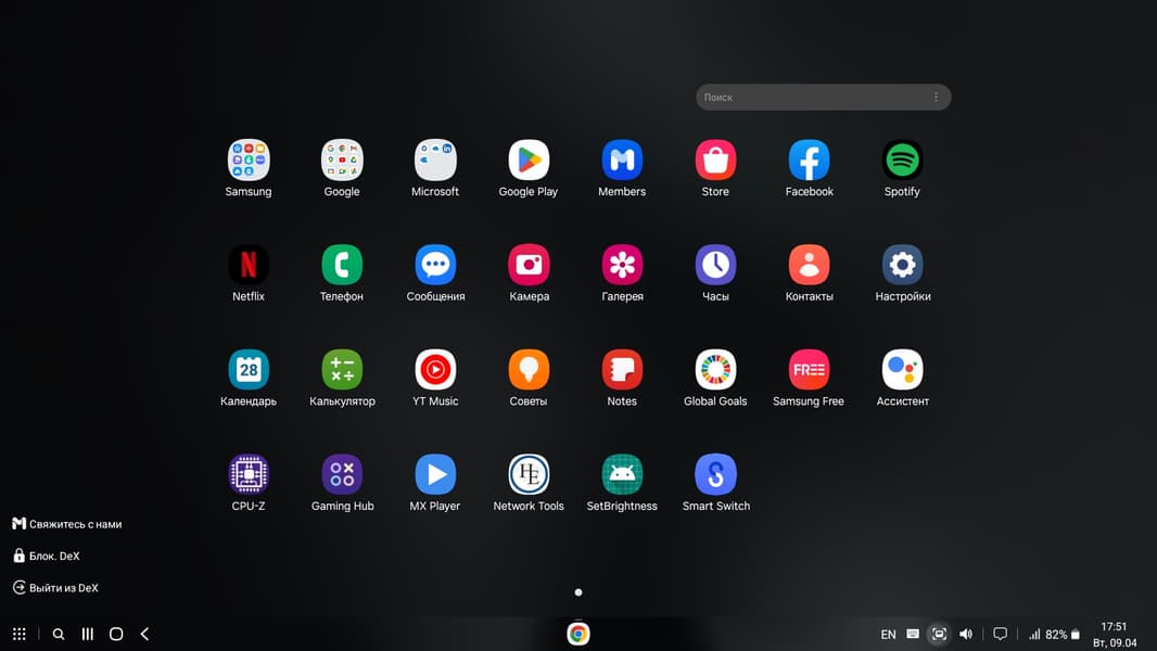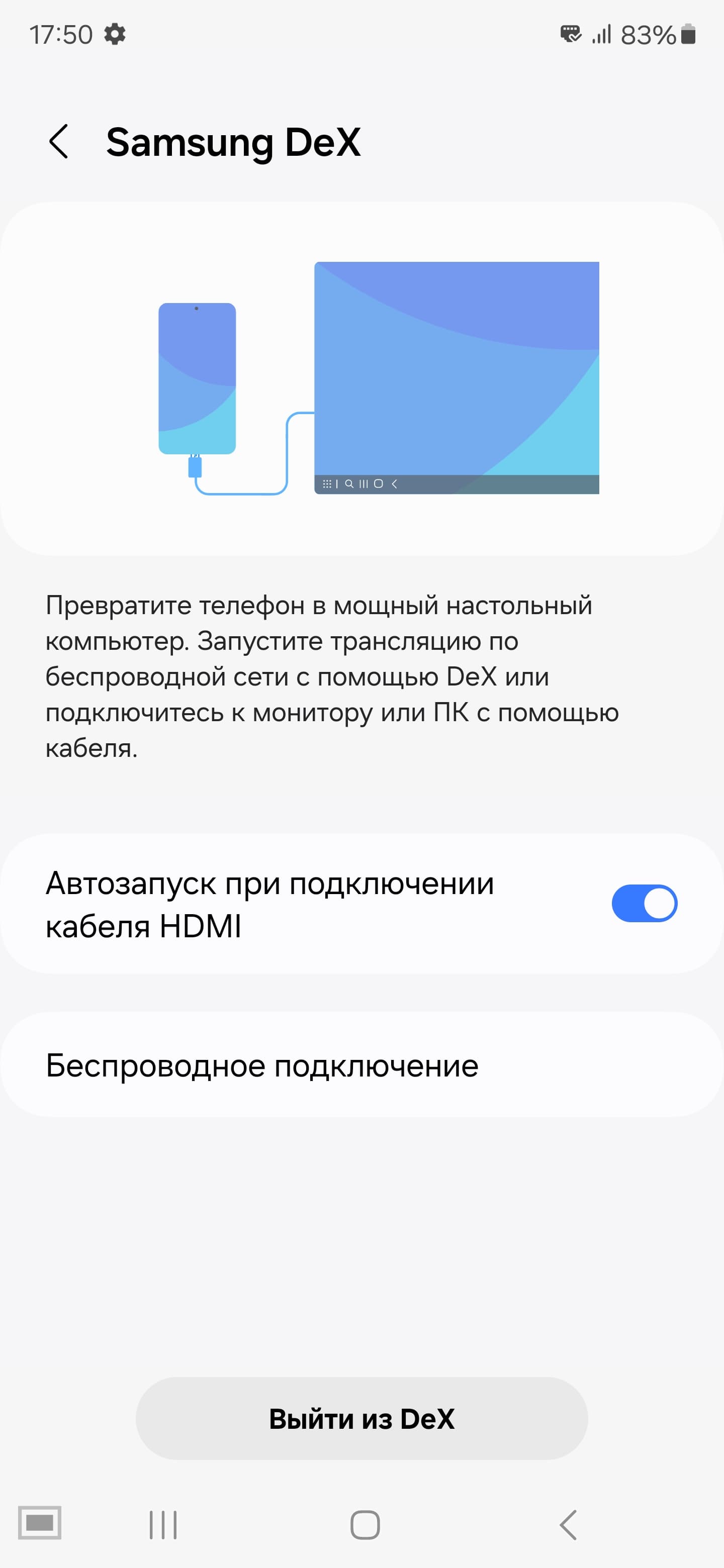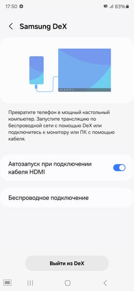 При подключении к нашему монитору вывод видео осуществляется в режиме 1080p при кадровой частоте 60 Гц. Режимов работы два: дублирование экрана смартфона (Screen Mirroring) и работа в режиме Samsung DeX — вывод альтернативного рабочего стола. Режим работы выбирает пользователь. В режиме Samsung DeX на экран монитора выводится изображение альтернативного рабочего стола, а экран смартфона может использоваться в качестве сенсорной панели координатного ввода или работать как обычно.