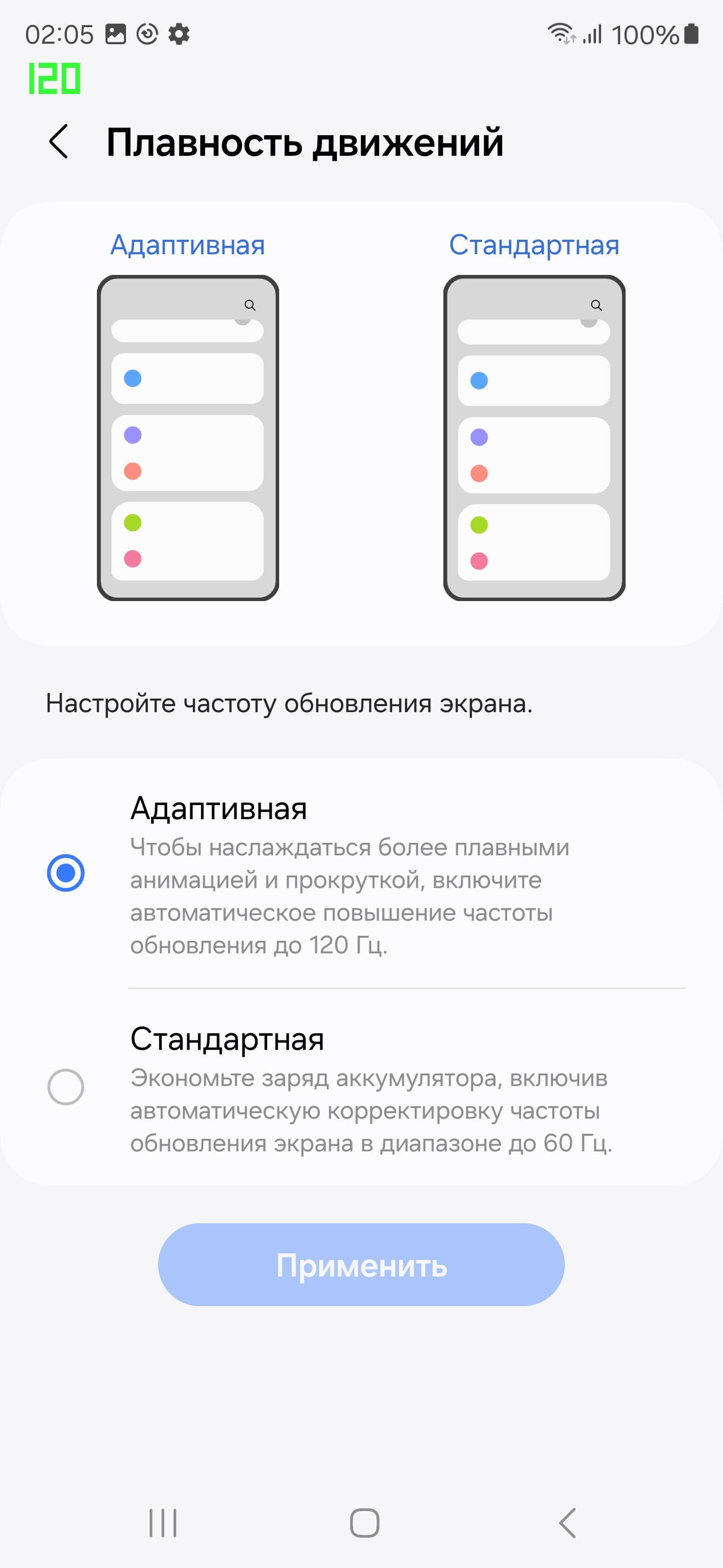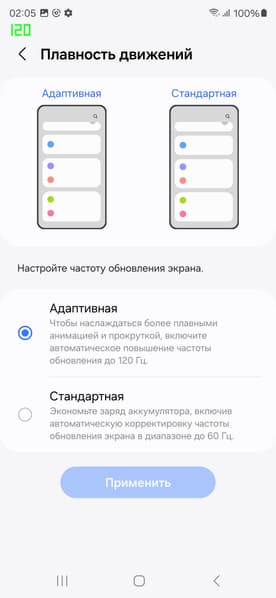 Сколько-либо заметных отличий от режима с частотой обновления 60 Гц нет. Заметим, что независимо от выбранного режима на статичном изображении (если не касаться экрана) где-то через секунду частота обновления снижается до 24 Гц.
