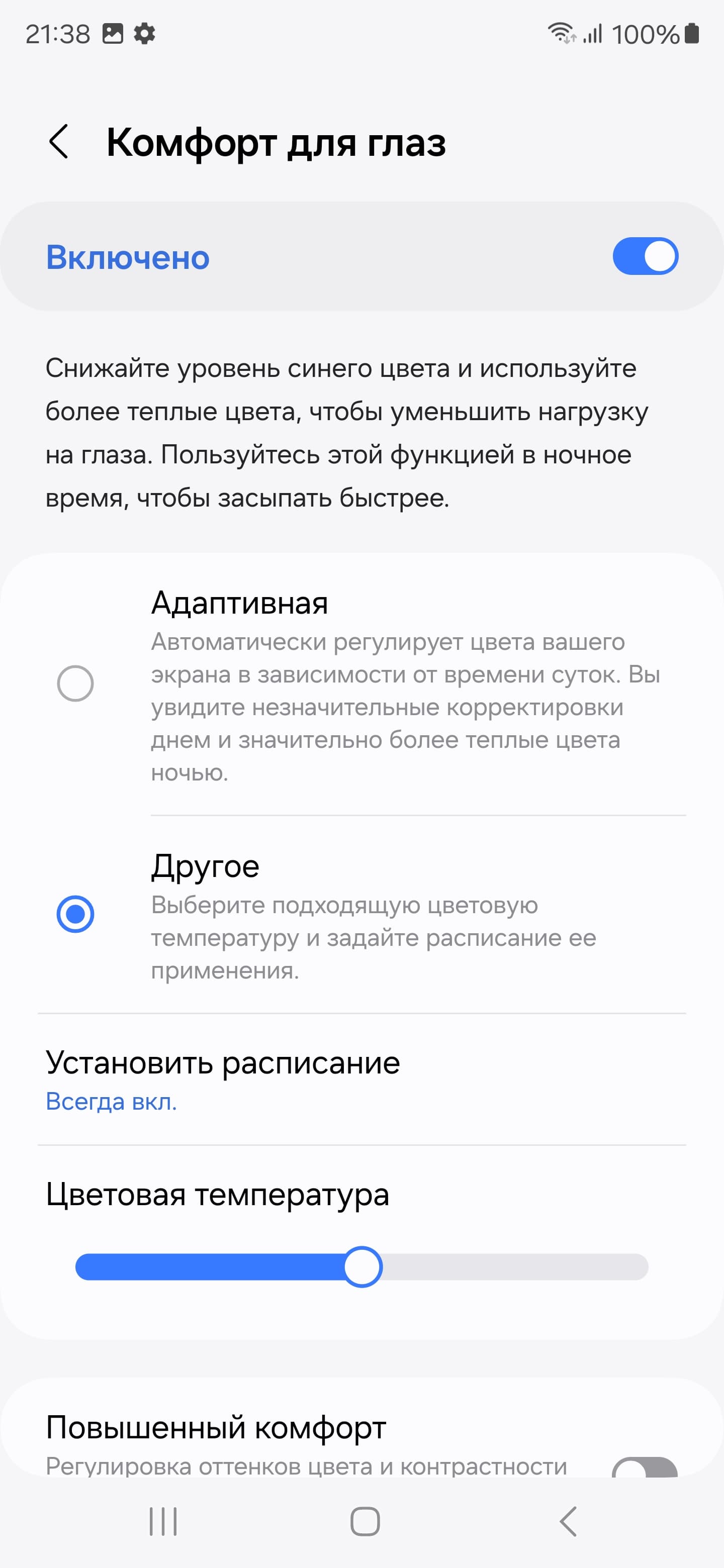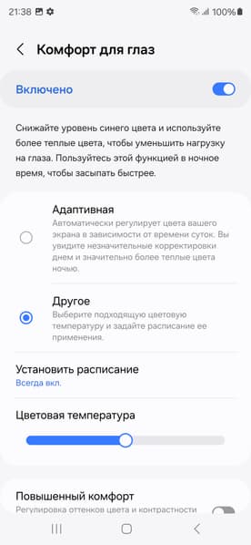 Есть функция Комфорт для глаз, для которой в настройках даже приведено белее-менее корректное описание.