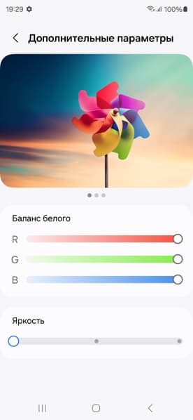 Почему-то только при выборе профиля Насыщенные цвета появляется возможность настройки цветового баланса регулировкой цветовой температуры и тремя регулировками интенсивности основных цветов, но из-за слишком широкого цветового охвата как раз в этом профиле нет смысла исправлять именно баланс.
